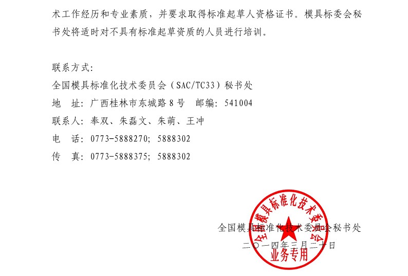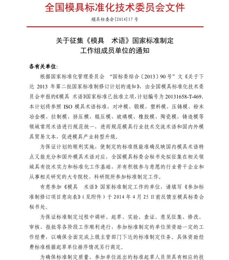關(guān)于征集《模具 術(shù)語(yǔ)》國家標準制定工作組成員單位的通知