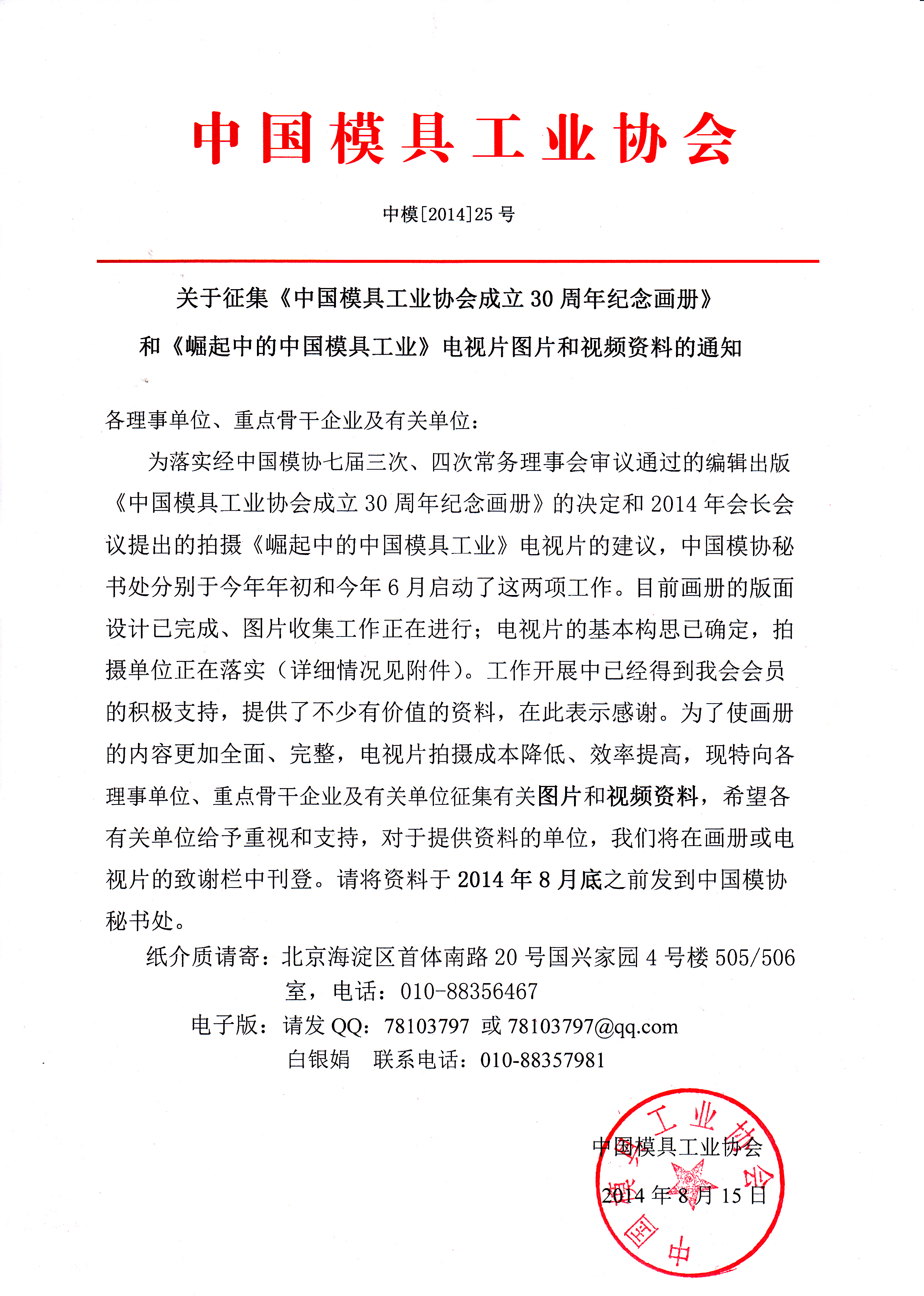 關(guān)于征集《中國模具工業(yè)協(xié)會(huì )成立30周年紀念畫(huà)冊》和《崛起中的中國模具工業(yè)》電視片圖片和視頻資料的通知