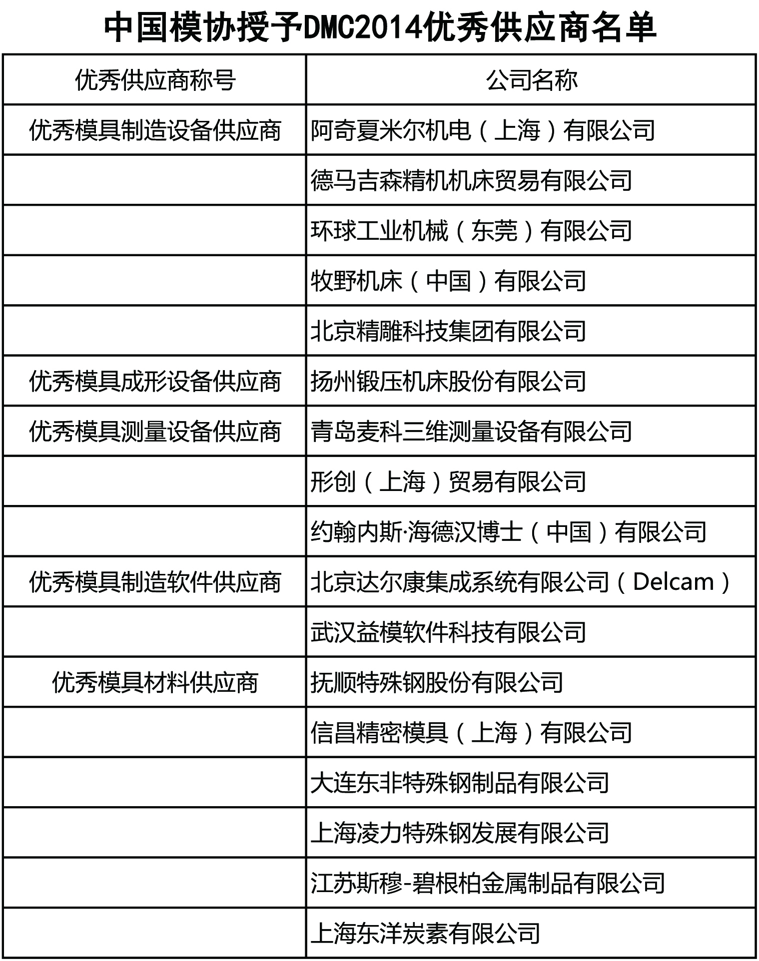 中國模具工業(yè)協(xié)會(huì )授予DMC2014優(yōu)秀供應商名單