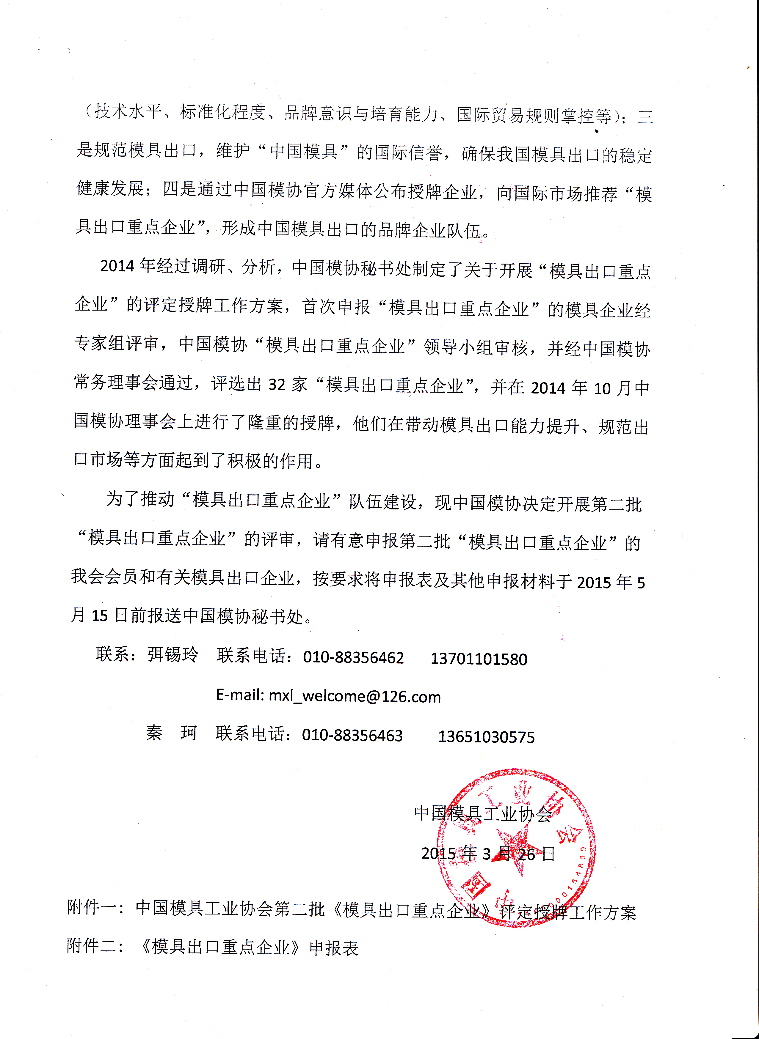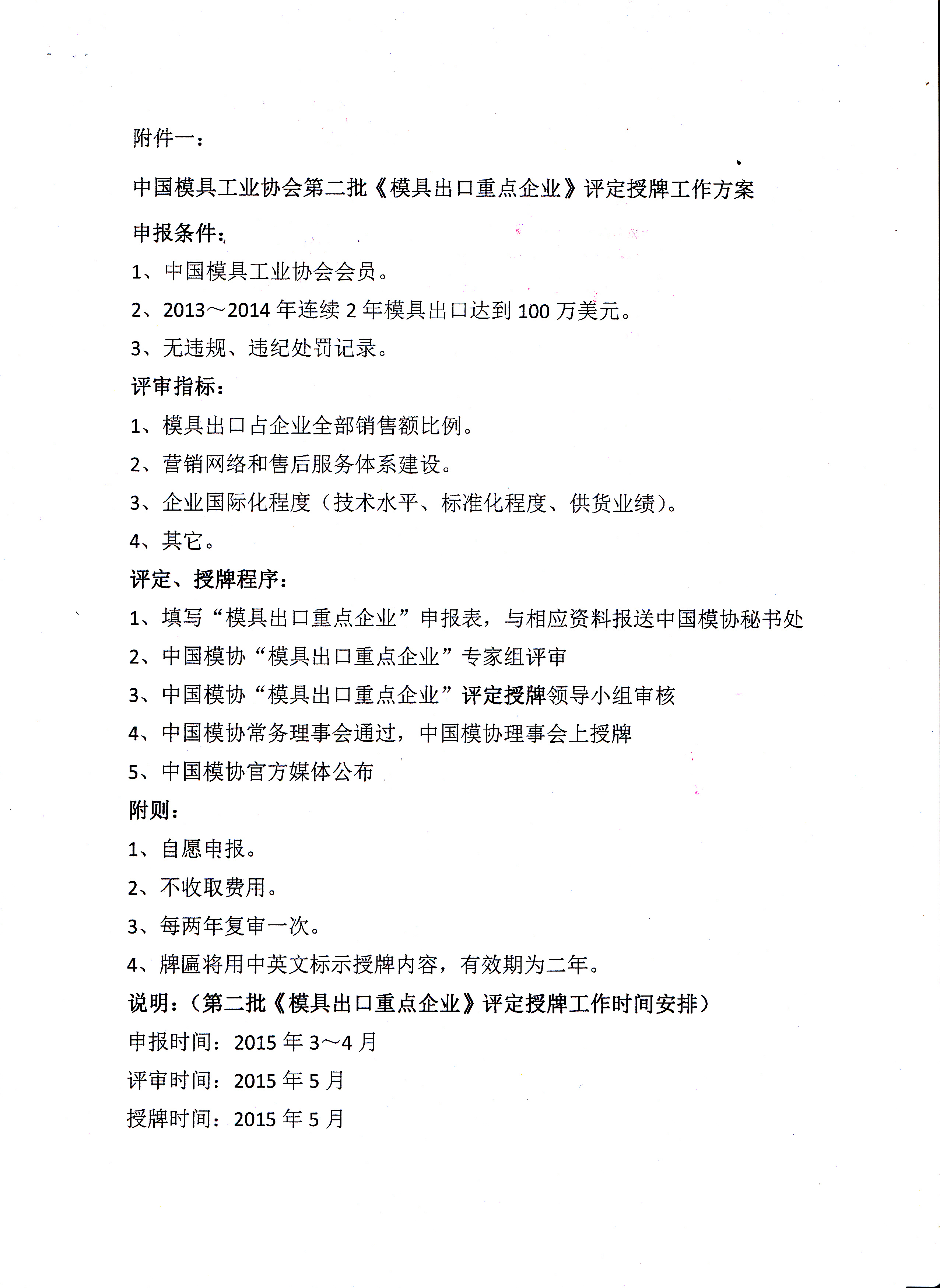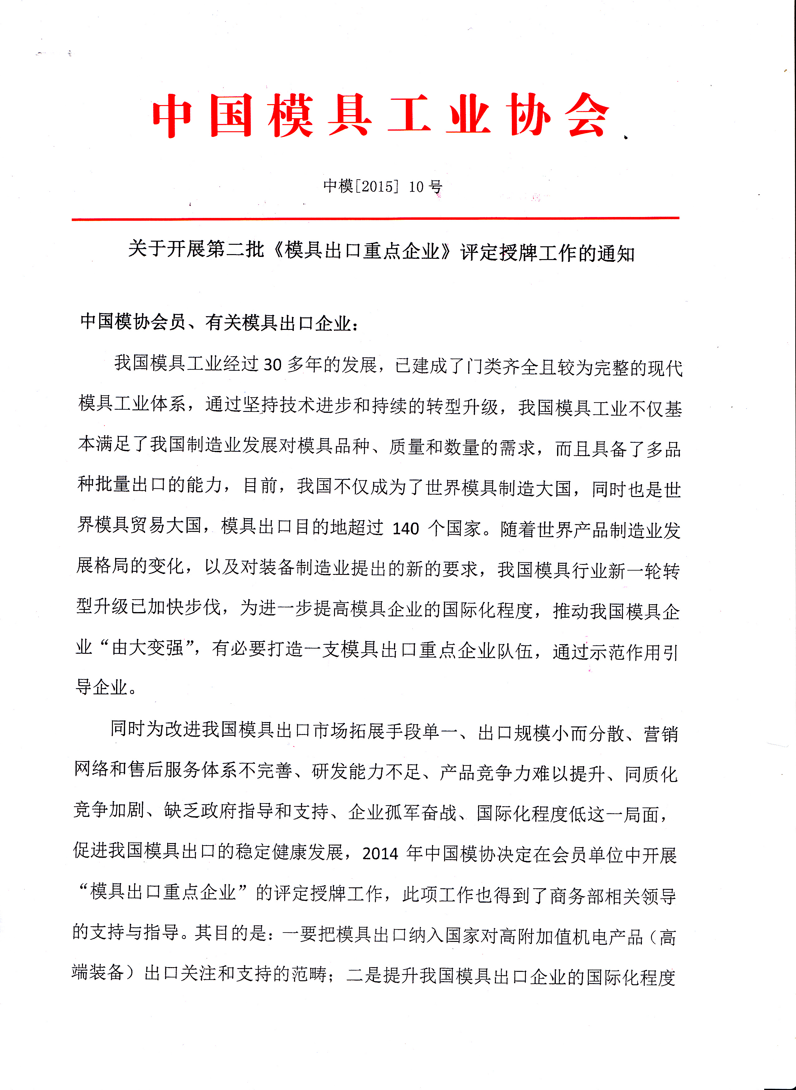 關(guān)于開(kāi)展第二批《模具出口重點(diǎn)企業(yè)》評定授牌工作的通知