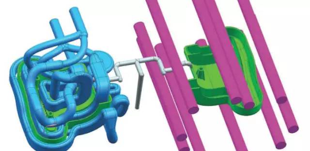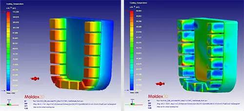 該案例中冷卻通道十分長(cháng)而且貼近模具表面,帶來(lái)了極佳的冷卻效果,使得模具周期減少了15%到45%,并且提高了最終產(chǎn)品的質(zhì)量。