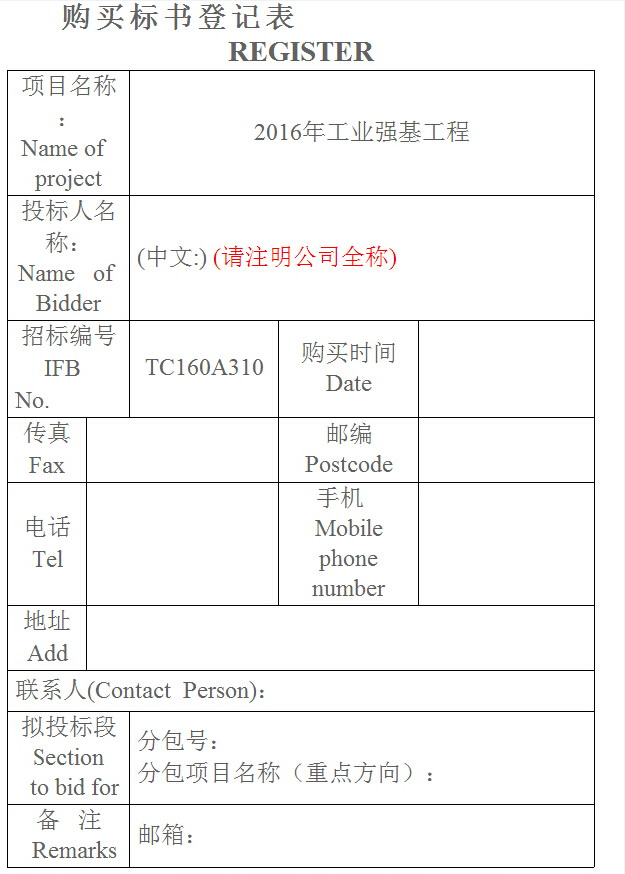 3、招標文件每包600元人民幣,售出不退,沒(méi)有購買(mǎi)招標文件的投標將被視為無(wú)效投標而被否決。如需郵購,請按我公司相關(guān)財務(wù)信息匯款,匯款單上應注明匯款用途、所購招標文件編號/包號,然后將匯款單復印件,購買(mǎi)單位名稱(chēng)、詳細通訊地址、郵編、辦公電話(huà)、手機、傳真及聯(lián)系人等內容傳真給我公司(詳見(jiàn)“購買(mǎi)標書(shū)登記表”附后),我公司收到傳真后將盡快以快遞方式將招標文件郵寄給貴單位,如需要可提供所購招標文件電子版。