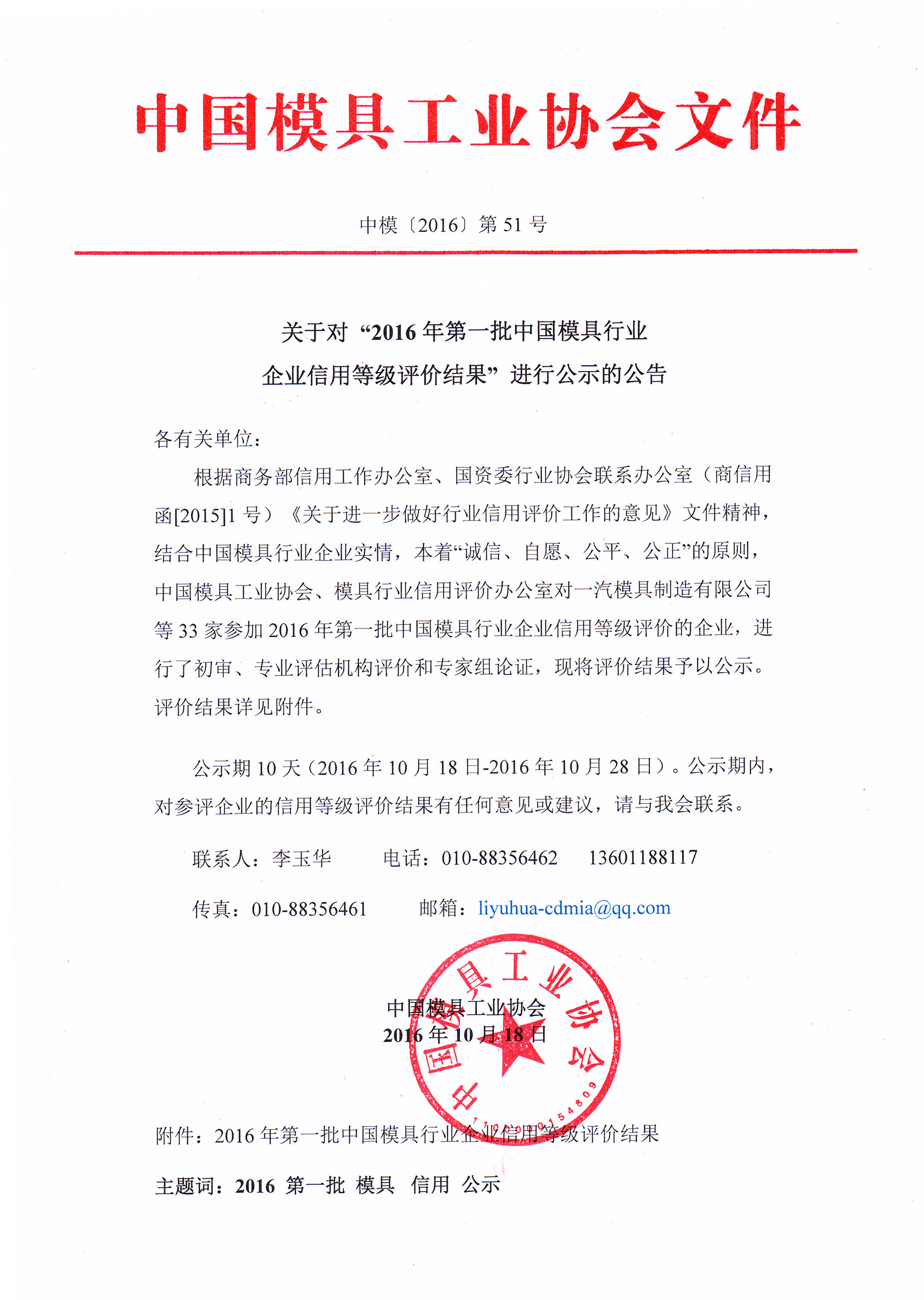 關(guān)于對“2016年第一批中國模具行業(yè)企業(yè)信用等級評價(jià)結果”進(jìn)行公示的公告
