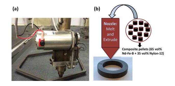 ORNL通過(guò)將NdFeB稀土粉末與聚合物混合在一起,然后通過(guò)熔融擠出頭將材料擠壓出來(lái),一層一層復合而成產(chǎn)品的形狀。復合顆粒中65%體積的材料為各向同性的NdFeB磁粉,35%體積的材料為聚酰胺(尼龍)。
