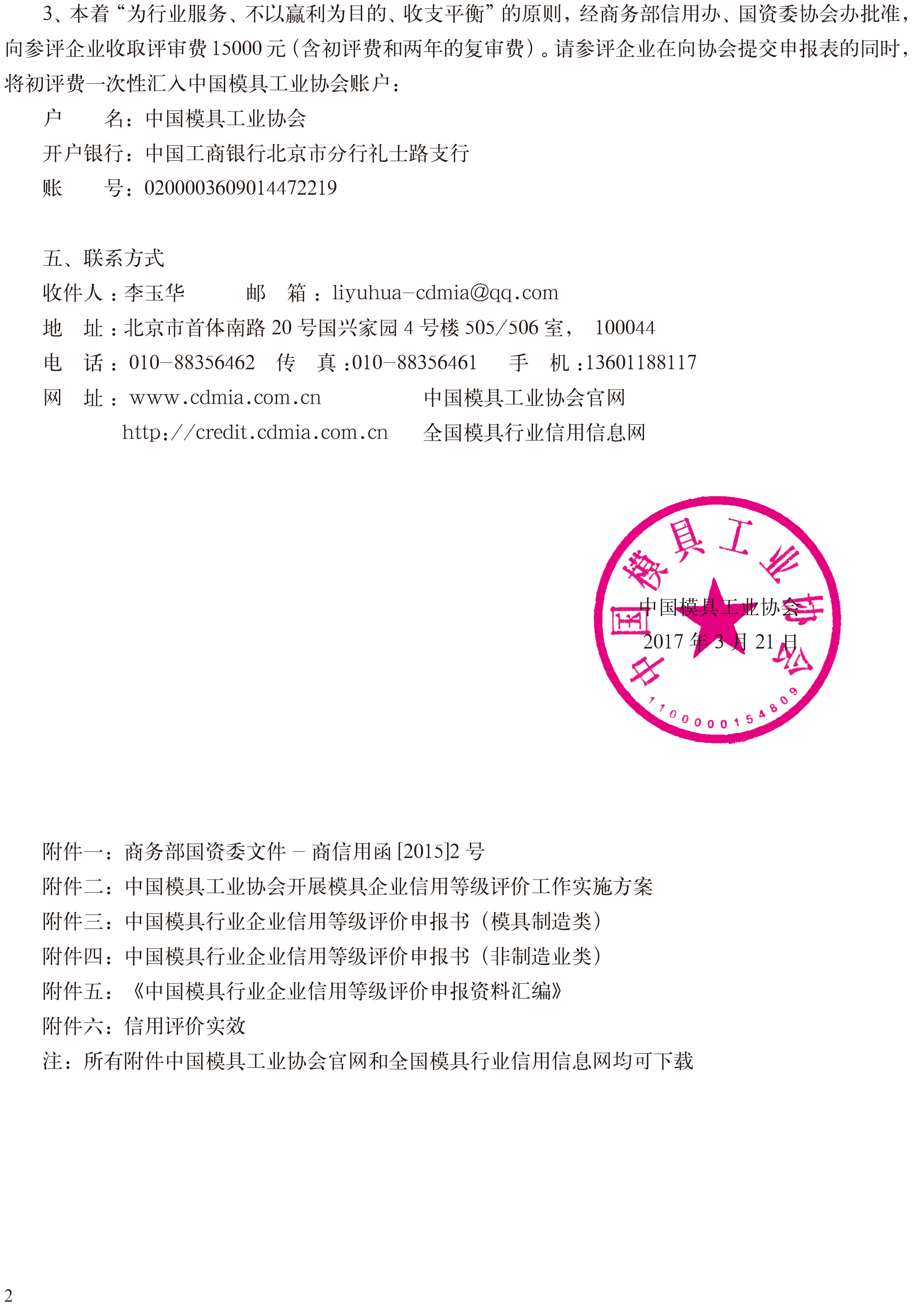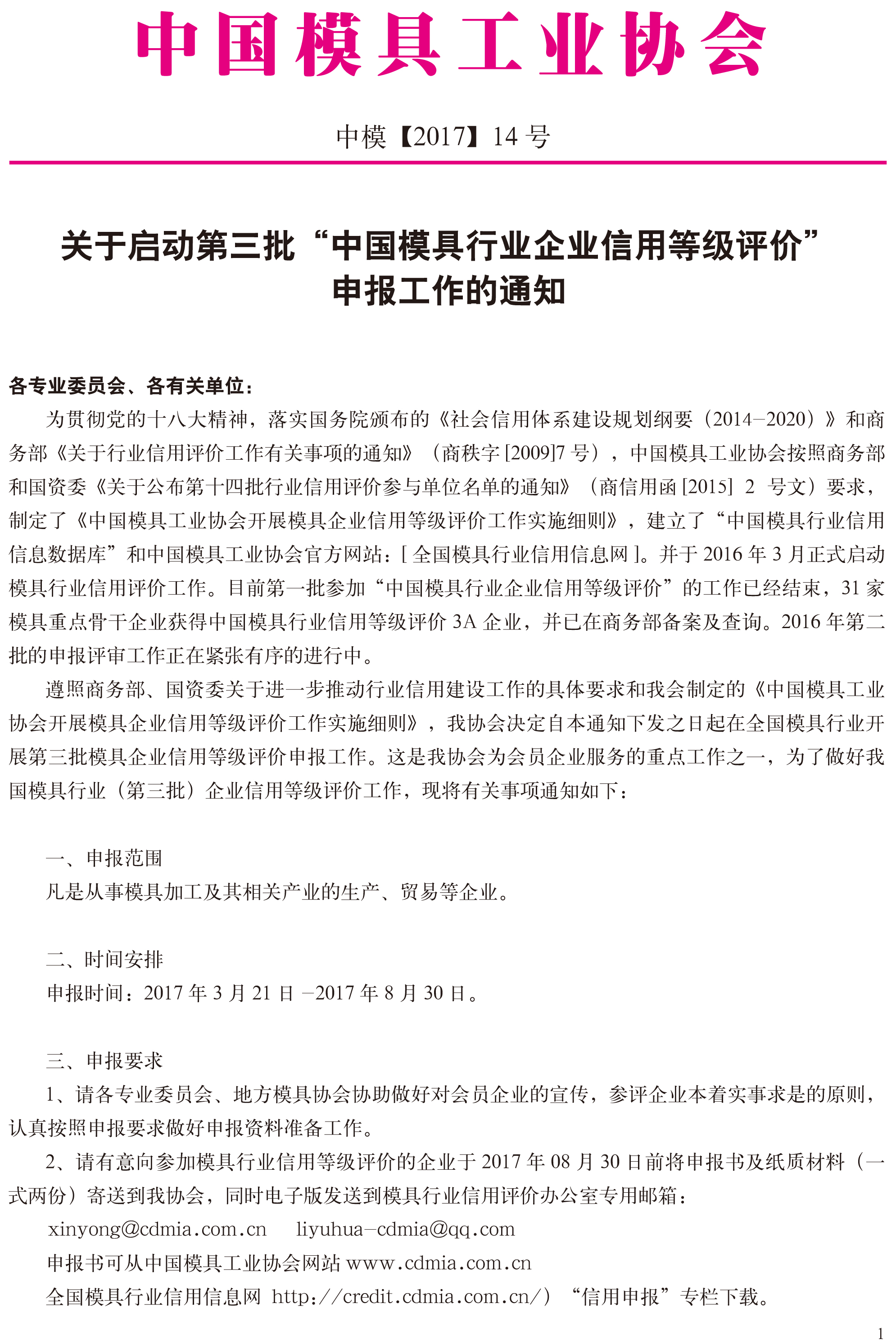 關(guān)于啟動(dòng)第三批“中國模具行業(yè)企業(yè)信用等級評價(jià)”申報工作的通知