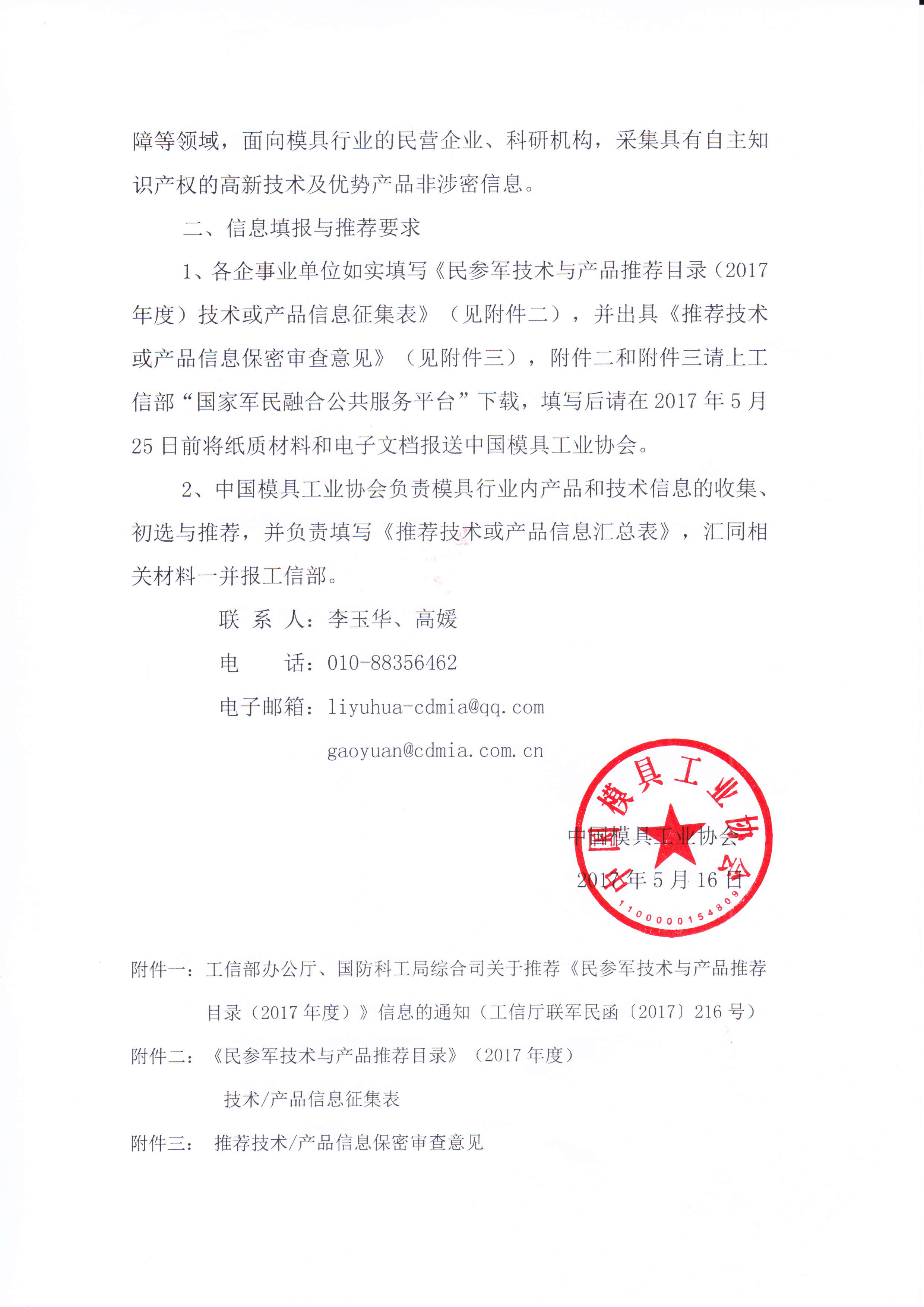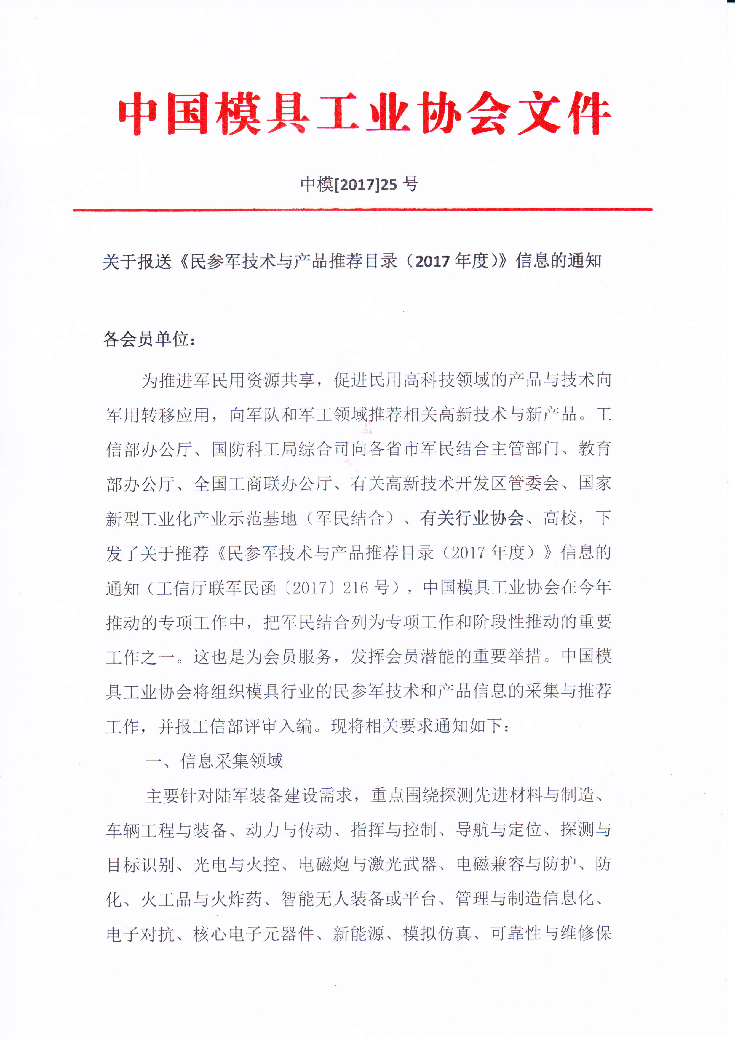 關(guān)于報送《民參軍技術(shù)與產(chǎn)品推薦目錄(2017年度)》信息的通知