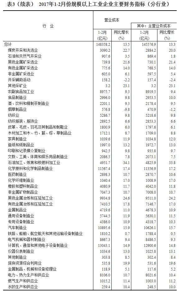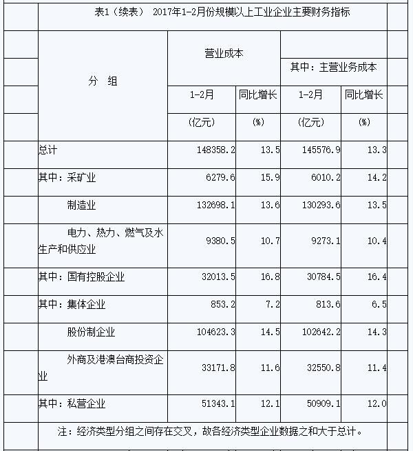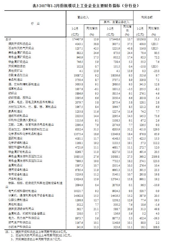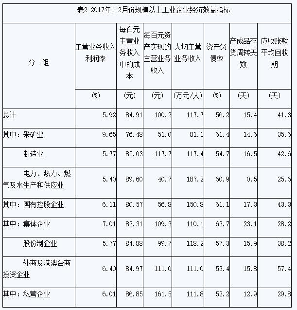 表1 2017年1-2月份規模以上工業(yè)企業(yè)主要財務(wù)指標