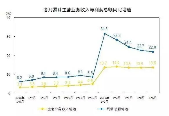 據國家統計局工業(yè)司何平博士解讀表示,2017年6月份,中國規模以上工業(yè)企業(yè)利潤同比增長(cháng)19.1%,增速比5月份加快2.4個(gè)百分點(diǎn);上半年,利潤同比增長(cháng)22%,增速比1-5月份放緩0.7個(gè)百分點(diǎn)。