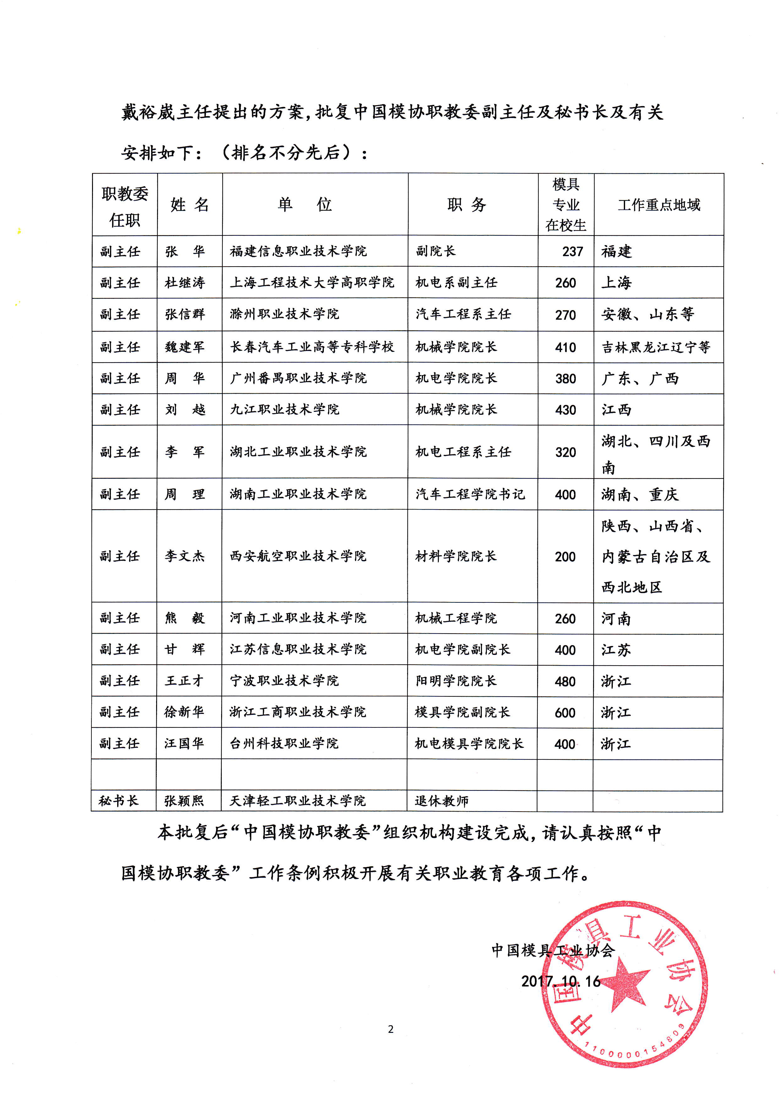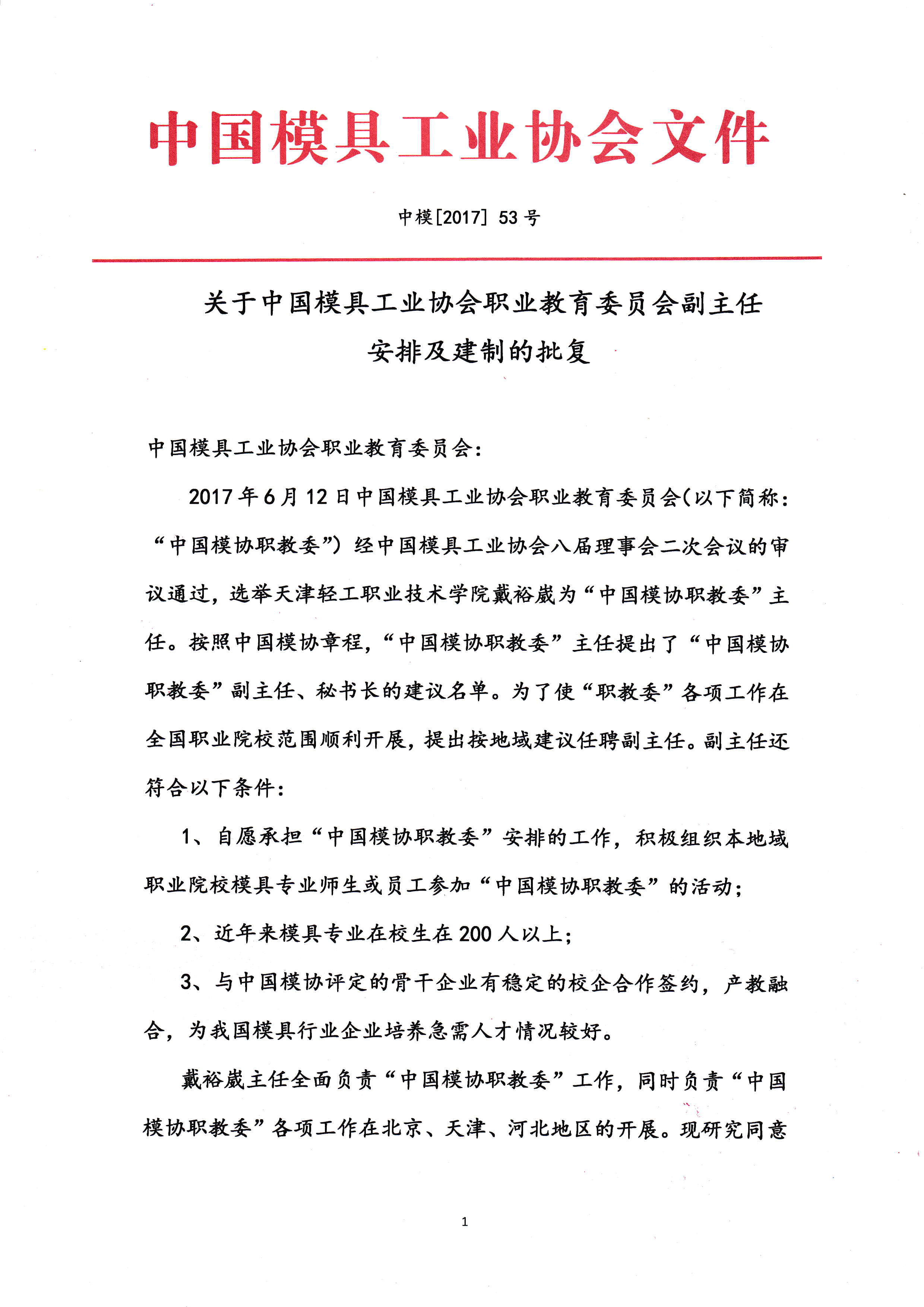關(guān)于中國模具工業(yè)協(xié)會(huì )職業(yè)教育委員會(huì )副主任安排及建制的批復