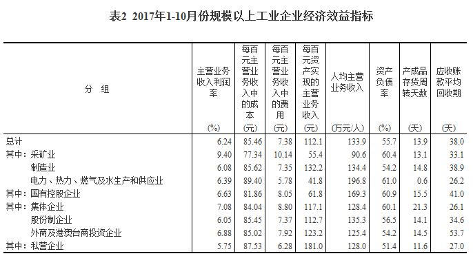 1-10月份,規模以上工業(yè)企業(yè)每百元主營(yíng)業(yè)務(wù)收入中的成本為85.46元,同比減少0.26元;每百元主營(yíng)業(yè)務(wù)收入中的費用為7.38元,同比減少0.25元;每百元資產(chǎn)實(shí)現的主營(yíng)業(yè)務(wù)收入為112.1元,同比增加4.6元;人均主營(yíng)業(yè)務(wù)收入為133.9萬(wàn)元,同比增加15.9萬(wàn)元;產(chǎn)成品存貨周轉天數為13.9天,同比減少0.6天;應收賬款平均回收期為38天,同比減少1天。