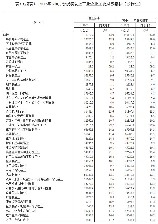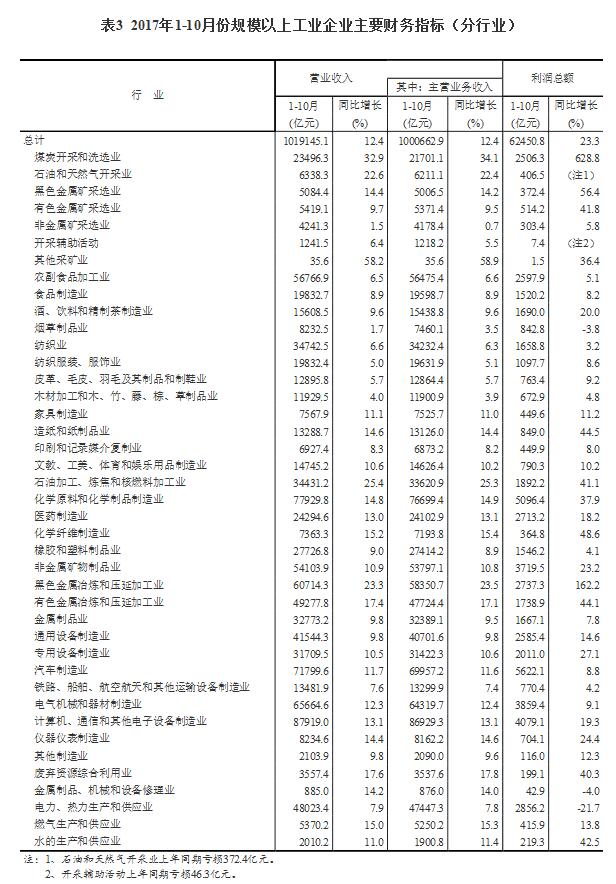 1-10月份,在41個(gè)工業(yè)大類(lèi)行業(yè)中,38個(gè)行業(yè)利潤總額同比增加,3個(gè)行業(yè)減少。主要行業(yè)利潤情況如下:煤炭開(kāi)采和洗選業(yè)利潤總額同比增長(cháng)6.3倍,農副食品加工業(yè)增長(cháng)5.1%,紡織業(yè)增長(cháng)3.2%,石油加工、煉焦和核燃料加工業(yè)增長(cháng)41.1%,化學(xué)原料和化學(xué)制品制造業(yè)增長(cháng)37.9%,非金屬礦物制品業(yè)增長(cháng)23.2%,黑色金屬冶煉和壓延加工業(yè)增長(cháng)1.6倍,有色金屬冶煉和壓延加工業(yè)增長(cháng)44.1%,通用設備制造業(yè)增長(cháng)14.6%,專(zhuān)用設備制造業(yè)增長(cháng)27.1%,汽車(chē)制造業(yè)增長(cháng)8.8%,電氣機械和器材制造業(yè)增長(cháng)9.1%,計算機、通信和其他電子設備制造業(yè)增長(cháng)19.3%,石油和天然氣開(kāi)采業(yè)由同期虧損轉為盈利,電力、熱力生產(chǎn)和供應業(yè)利潤總額同比下降21.7%。