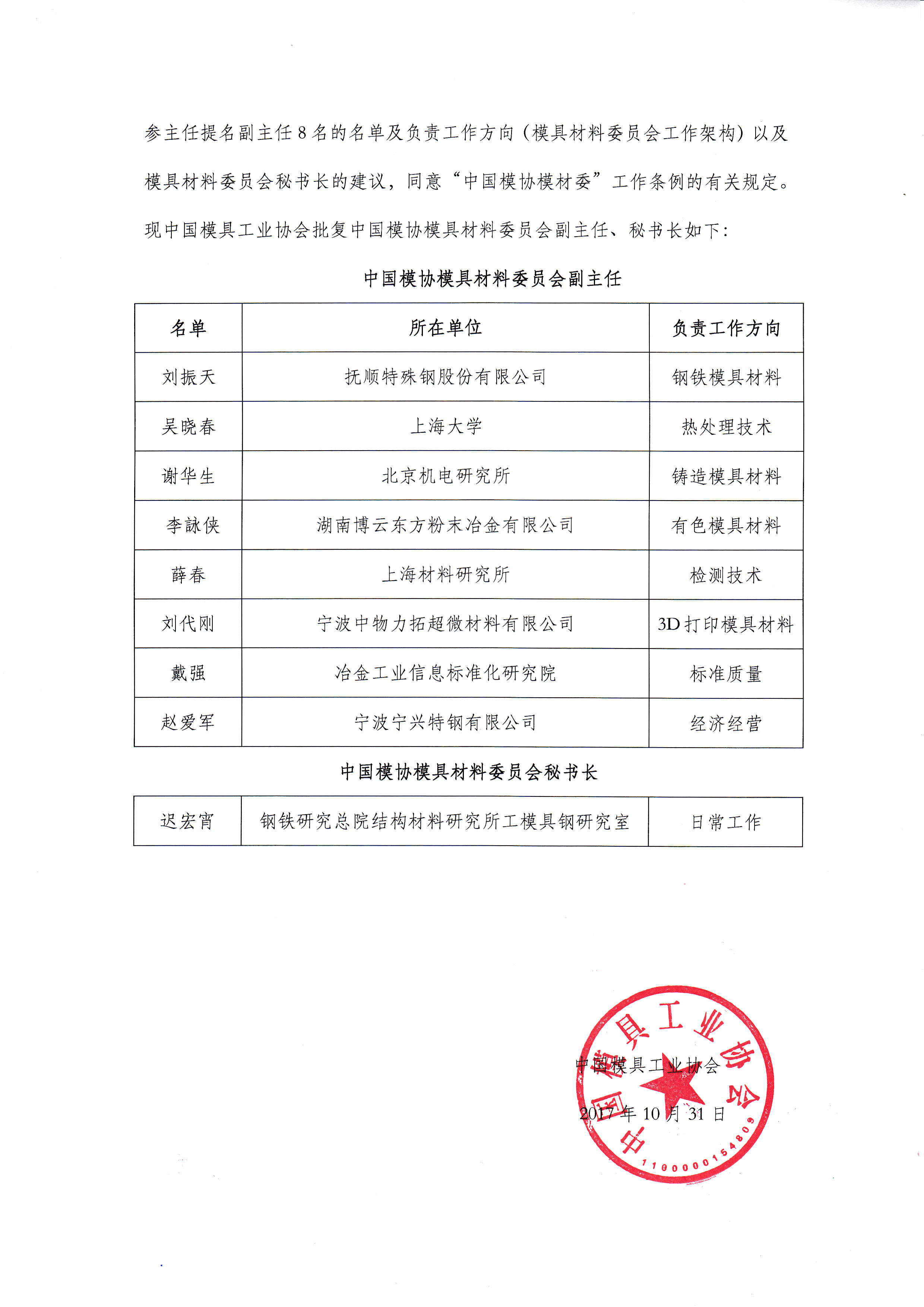 模具材料委員會(huì )關(guān)于新一屆副主任、秘書(shū)長(cháng)組成及工作架構的批復