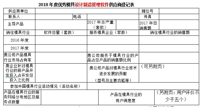 現代模具工業(yè)是高技術(shù)背景下的資金和技術(shù)密集型工業(yè)。隨著(zhù)模具行業(yè)的發(fā)展,現代模具要實(shí)現數字化設計、數字化制造、數字化管理、數字化生產(chǎn)流程來(lái)實(shí)現模具工業(yè)的現代化。模具軟件是降本提質(zhì)增效的重要至關(guān)領(lǐng)域,為了服務(wù)模具企業(yè)提高模具軟件工具使用效率,提升使用能力,第十八屆中國國際模具技術(shù)和設備展覽會(huì )主辦單位之一的中國模具工業(yè)協(xié)會(huì )十分注重展覽會(huì )的內涵,在歷屆展覽會(huì )上均開(kāi)展了對展覽會(huì )展品的評述工作,至今已成定式。為了更好地為模具企業(yè)提供多元的服務(wù),為企業(yè)的模具制造加工、集成、協(xié)同解決方案提供保障,進(jìn)一步推動(dòng)模具及模具相關(guān)行業(yè)交流與互動(dòng),在第十八屆中國國際模具技術(shù)和設備展覽會(huì )期間,中國模具工業(yè)協(xié)會(huì )委托中國模具工業(yè)協(xié)會(huì )數字化信息化委員會(huì )(數信委),本著(zhù)自愿的原則,依據供應商軟件水平,在模具行業(yè)服務(wù)能能力、市場(chǎng)占有率的高低、對模具行業(yè)服務(wù)滿(mǎn)意等行業(yè)貢獻指標,并結合模具企業(yè)的意見(jiàn)開(kāi)展評定優(yōu)秀模具設計制造管理軟件供應商活動(dòng),活動(dòng)不收取參評單位任何費用?,F將優(yōu)秀模具設計制造管理軟件供應商登記表發(fā)給你們,請予認真填寫(xiě), 盡快返回中國模具工業(yè)協(xié)會(huì )數字化信息化委員會(huì ) 魏青收。