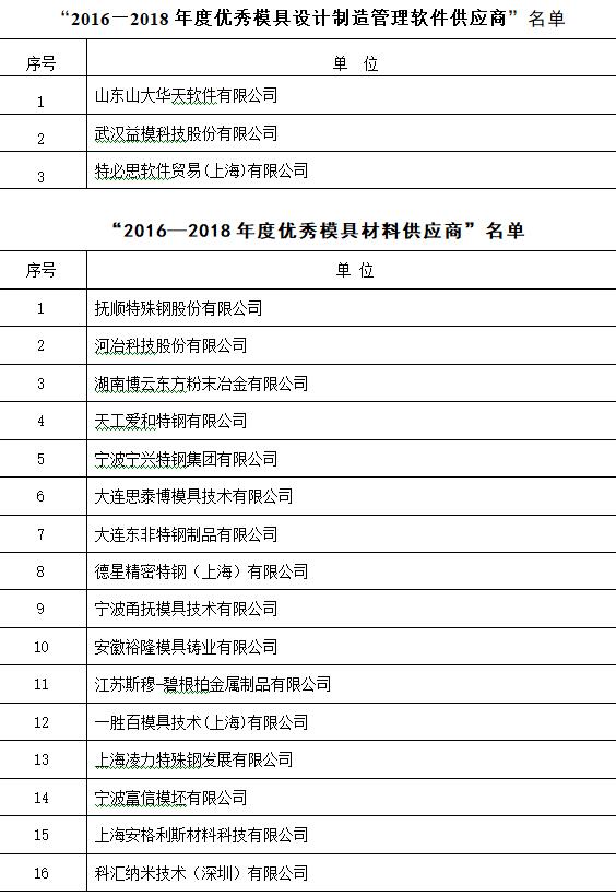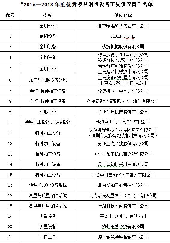 在知名品牌專(zhuān)業(yè)展會(huì )——中國國際模具技術(shù)和設備展覽會(huì )DMC上開(kāi)展優(yōu)秀供應商的評選活動(dòng),得到了各行業(yè)的廣泛認可,被評定為優(yōu)秀供應商的企業(yè),將在模具企業(yè)的采購中獲得優(yōu)先推薦資格并在行業(yè)里得到廣泛的宣傳推廣,并在中國模協(xié)的官網(wǎng)上進(jìn)行公告,至今已成定式。DMC2018期間,中國模具工業(yè)協(xié)會(huì )委托中國模協(xié)裝備委員會(huì )、數字化信息化委員會(huì )、材料委員會(huì ),本著(zhù)自愿的原則,依據供應商的技術(shù)水平、在模具行業(yè)的服務(wù)能力、市場(chǎng)占有率的高低、模具行業(yè)服務(wù)滿(mǎn)意度等行業(yè)貢獻指標,并結合模具企業(yè)的意見(jiàn),最終評選出21家“2016—2018年度優(yōu)秀模具制造設備工具供應商”、3家“2016—2018年度優(yōu)秀模具設計制造管理軟件供應商”、16家“2016—2018年度優(yōu)秀模具材料供應商”(同時(shí)見(jiàn)www.wongran.com,diemouldchina.com.cn),具體名單如下所示,排名均不分先后。