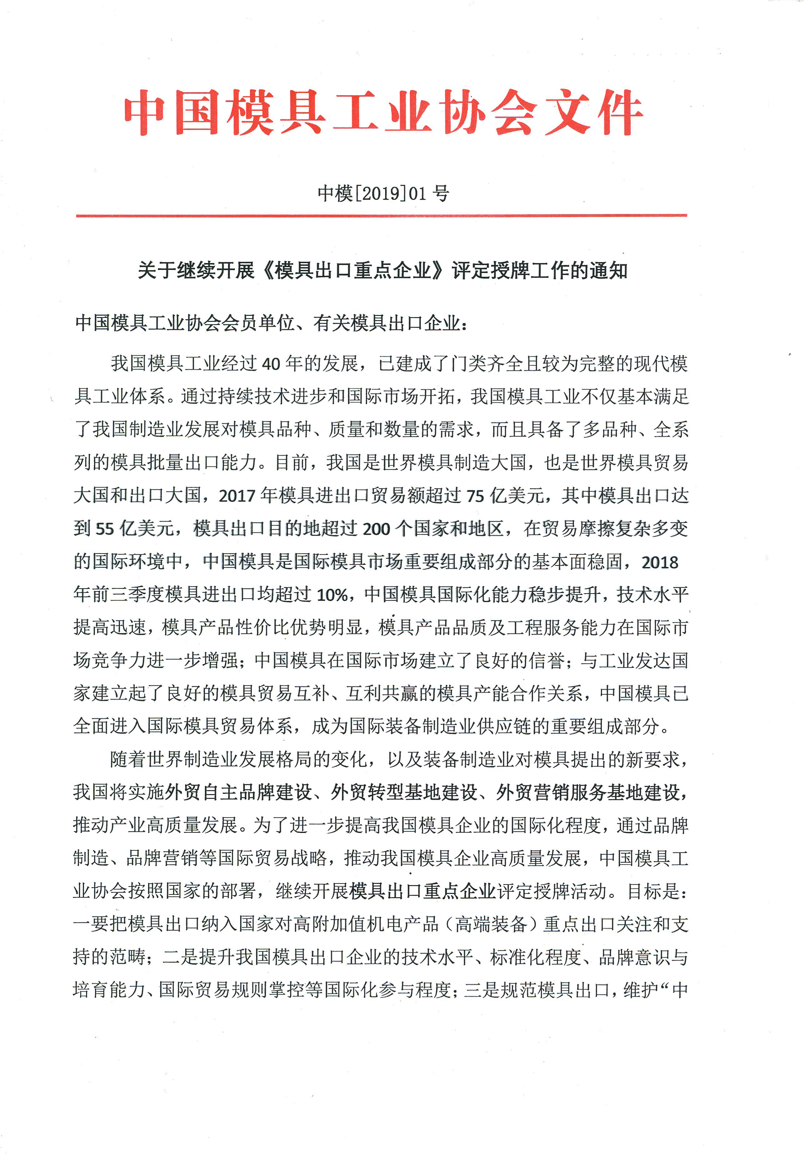關(guān)于繼續開(kāi)展《模具出口重點(diǎn)企業(yè)》評定授牌工作的通知