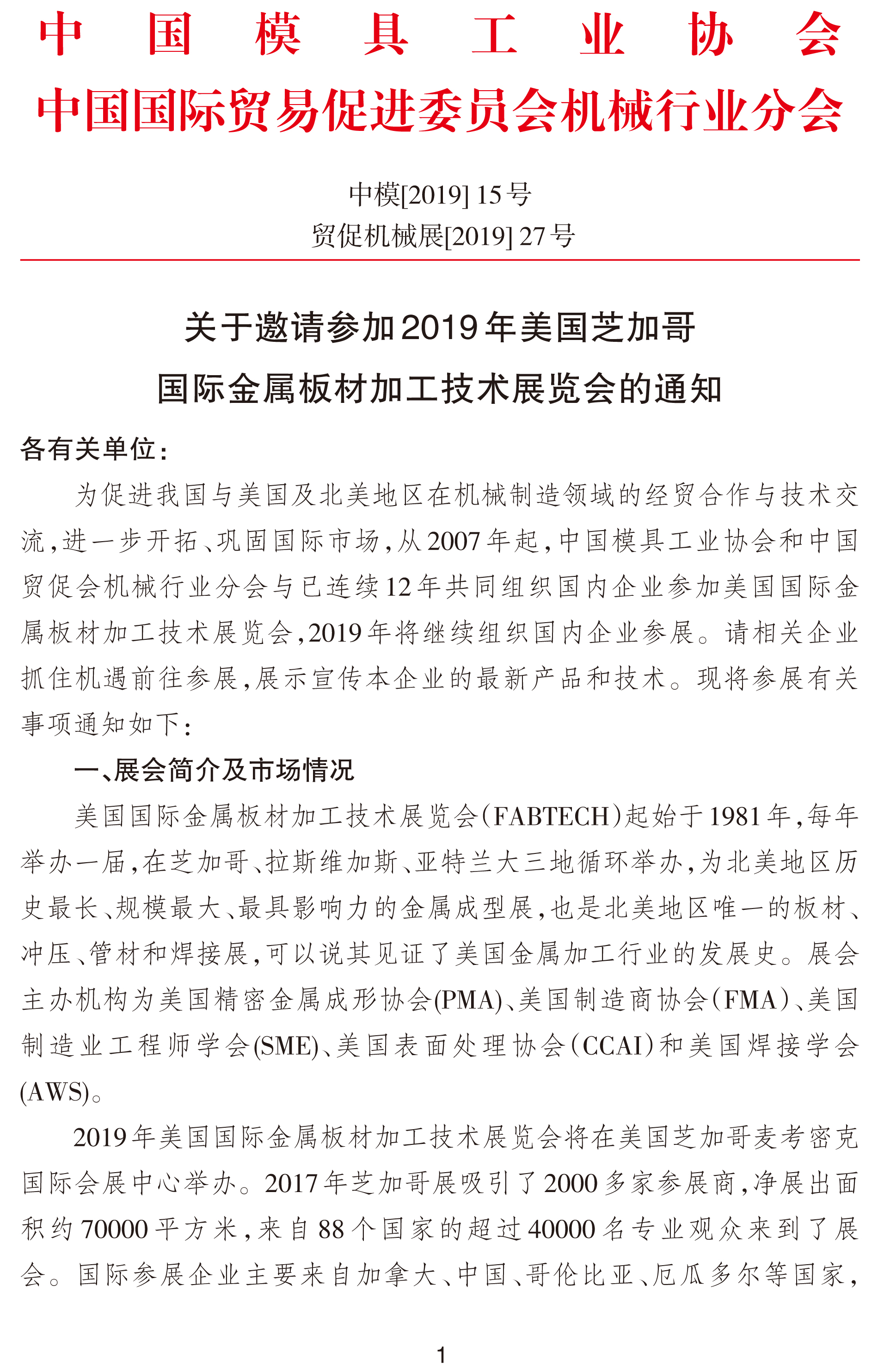 關(guān)于邀請參加2019年美國芝加哥國際金屬板材加工技術(shù)展覽會(huì )的通知
