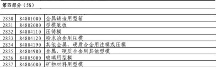 小編對附件中的清單進(jìn)行整理,和模具行業(yè)相關(guān)的項目有:清單二中的第四部分(注:自2019年12月15日12時(shí)01分起,對附件2第四部分所列1815個(gè)稅目商品加征5%的關(guān)稅)