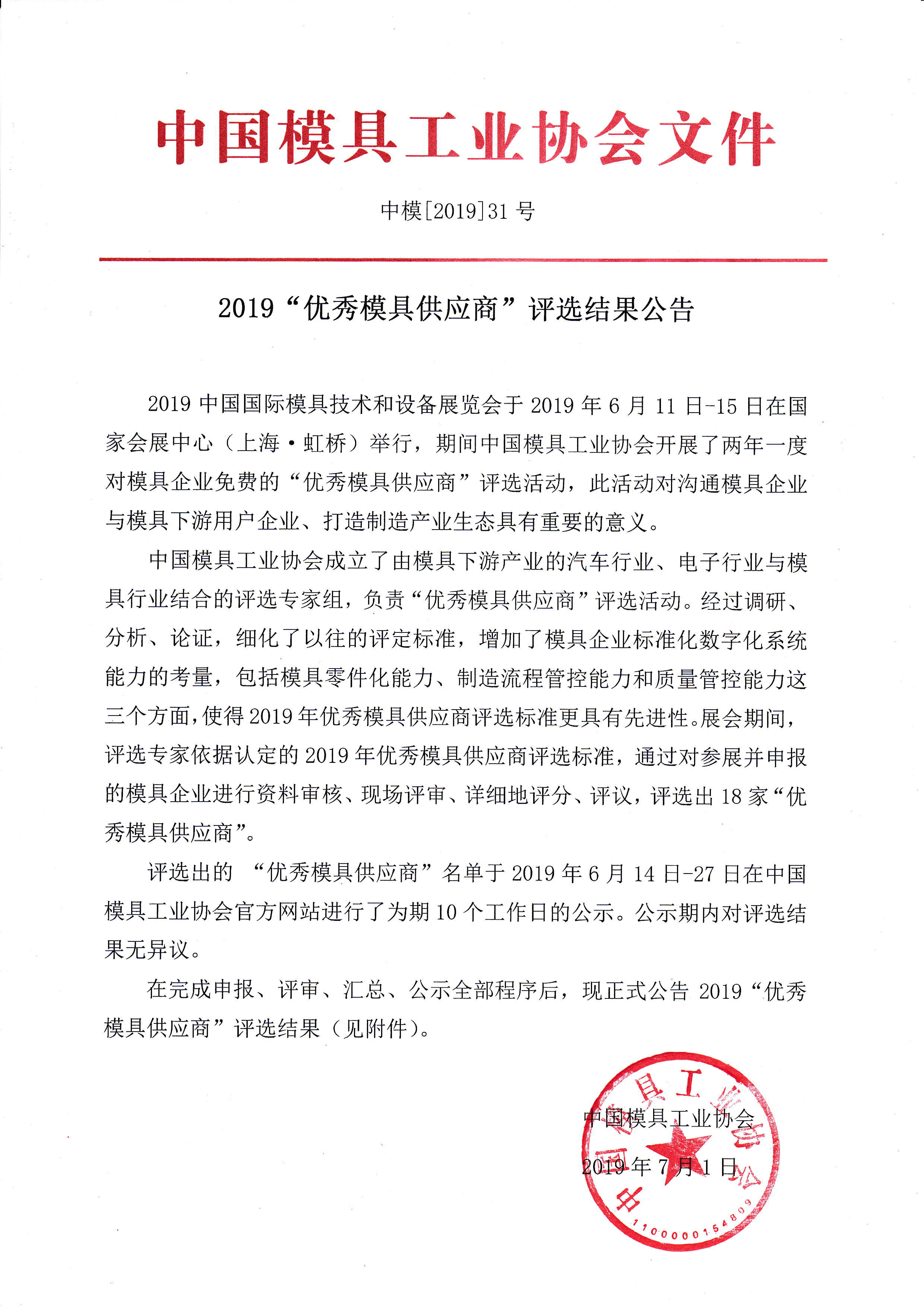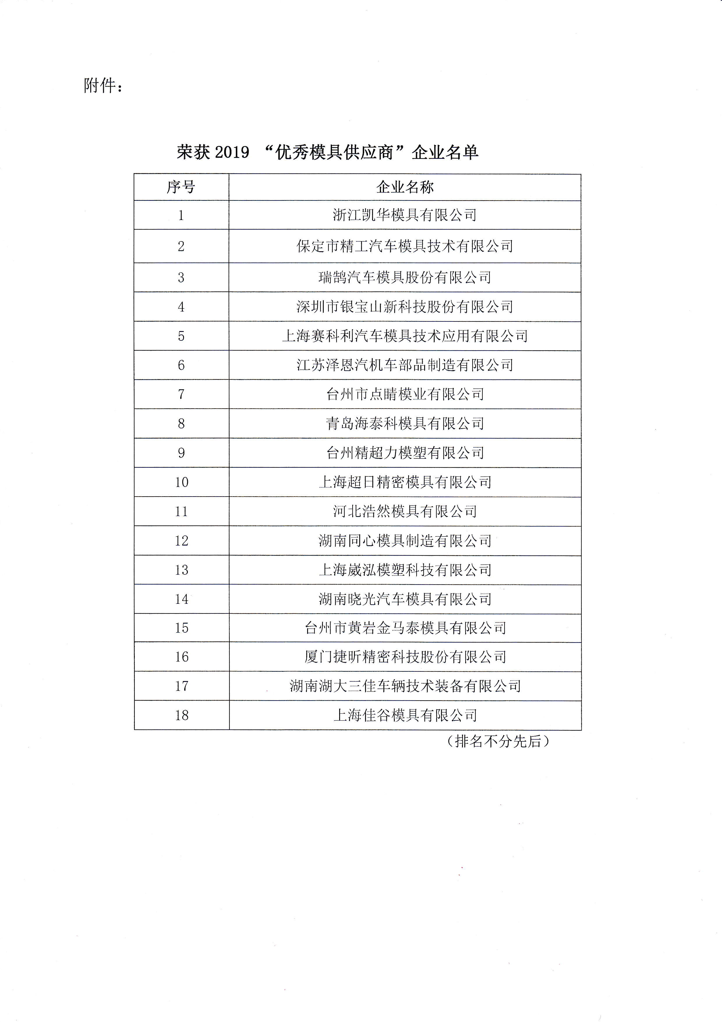 2019“優(yōu)秀模具供應商”評選結果公告