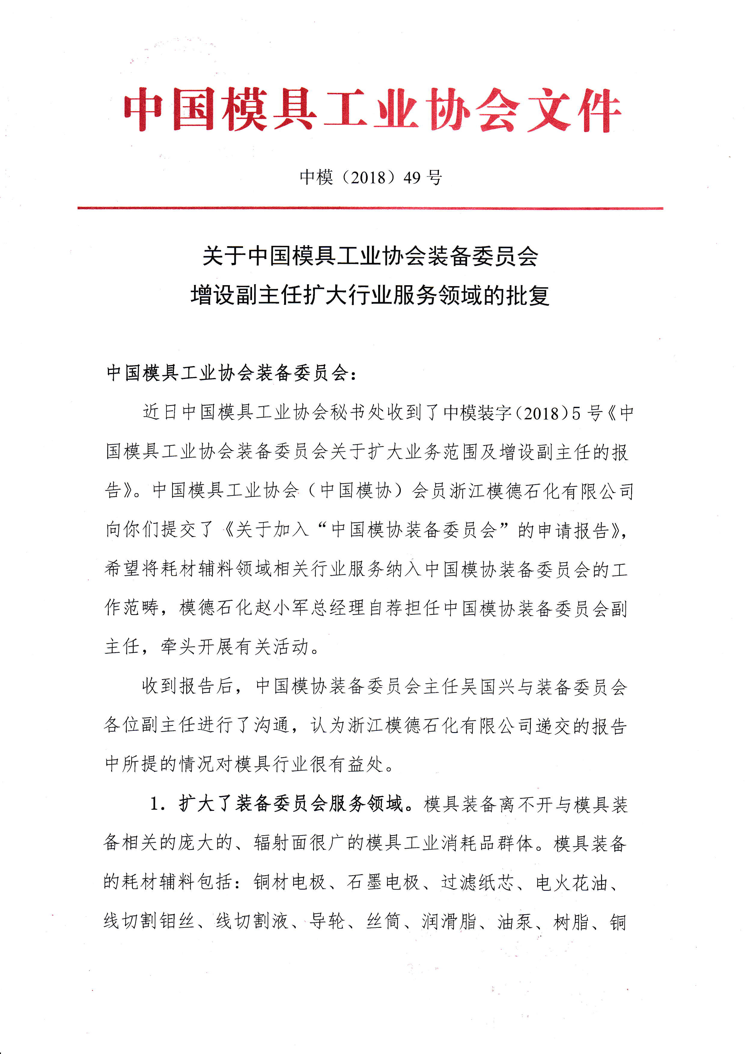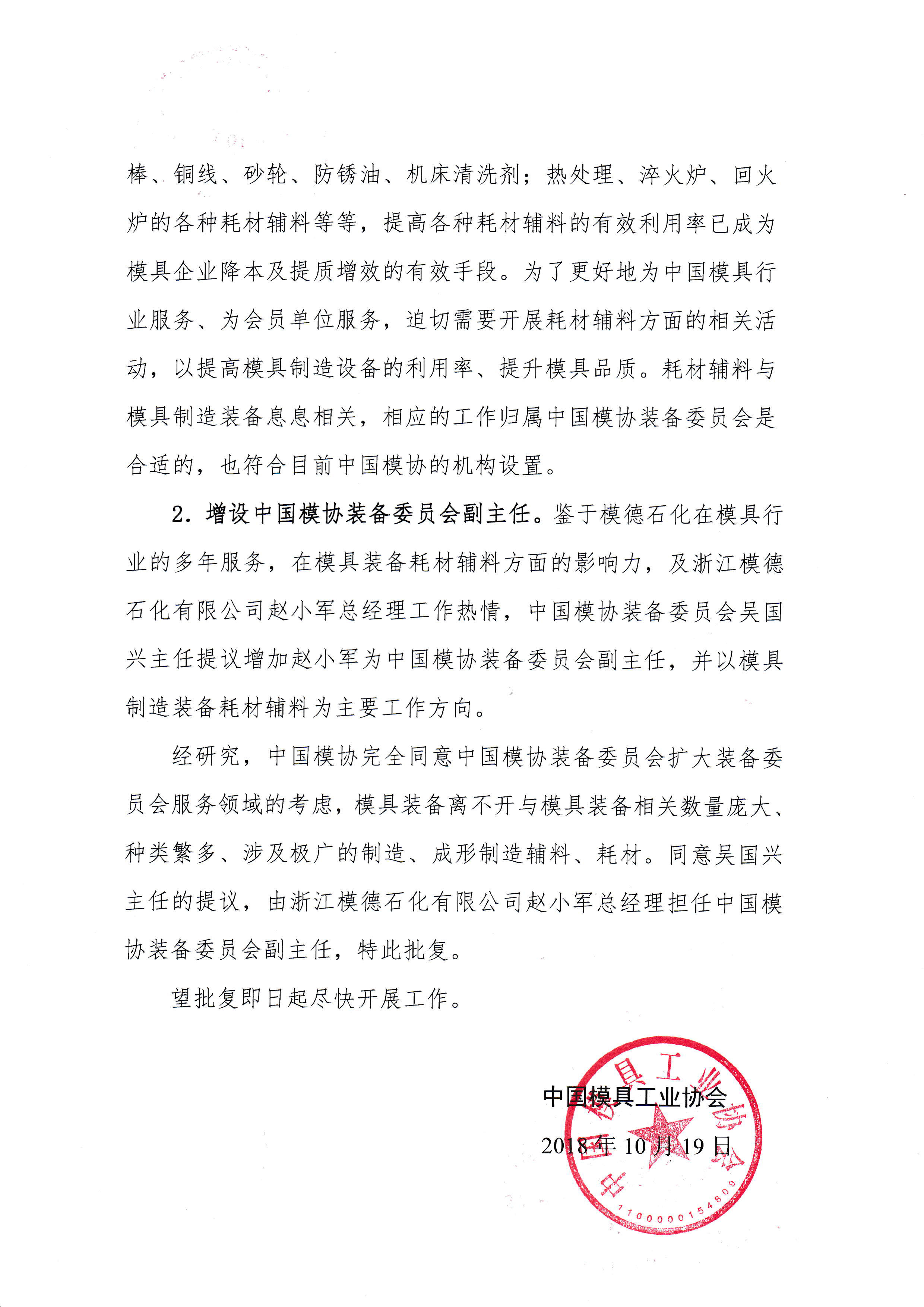 關(guān)于中國模具工業(yè)協(xié)會(huì )裝備委員會(huì )增設副主任擴大行業(yè)服務(wù)領(lǐng)域的批復