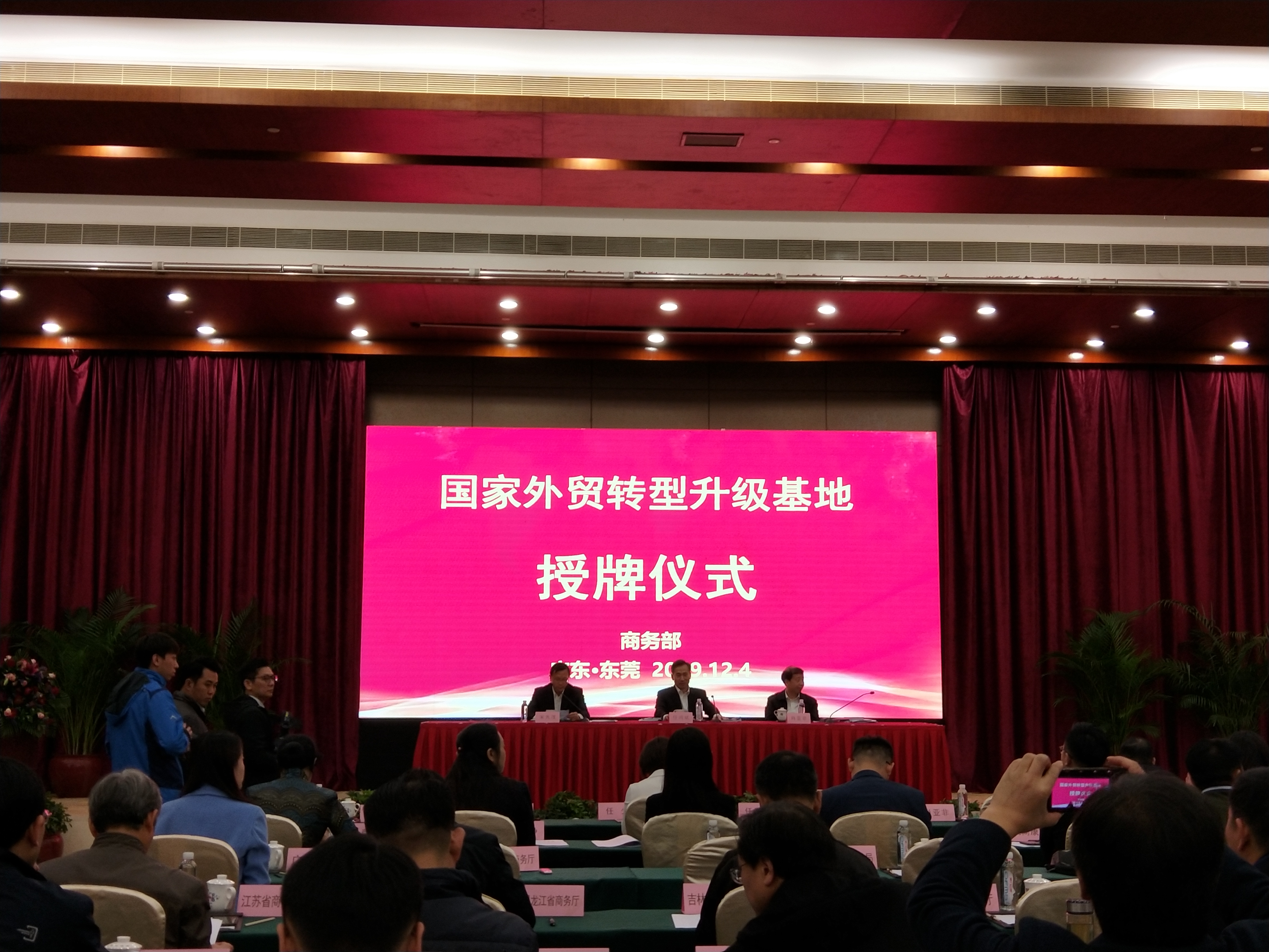 12月4日,商務(wù)部國家外貿轉型升級基地授牌儀式在東莞舉行,商務(wù)部部長(cháng)助理任鴻斌為2019 年認定的65 個(gè)國家外貿轉型升級基地授牌,并在國家外貿轉型升級基地建設培訓班做了《堅持新發(fā)展理念,加快外貿轉型升級基地建設推進(jìn)貿易高質(zhì)量發(fā)展》的專(zhuān)題講座。商務(wù)部外貿司副司長(cháng)宋先茂、商務(wù)部駐廣州副特派員謝瑩、廣東省商務(wù)廳副廳長(cháng)任少、東莞市市長(cháng)肖亞非、商務(wù)部國際商報社副社長(cháng)史柳石,以及全國各省市商務(wù)廳(委、局)與65家基地負責人出席了授牌儀式。