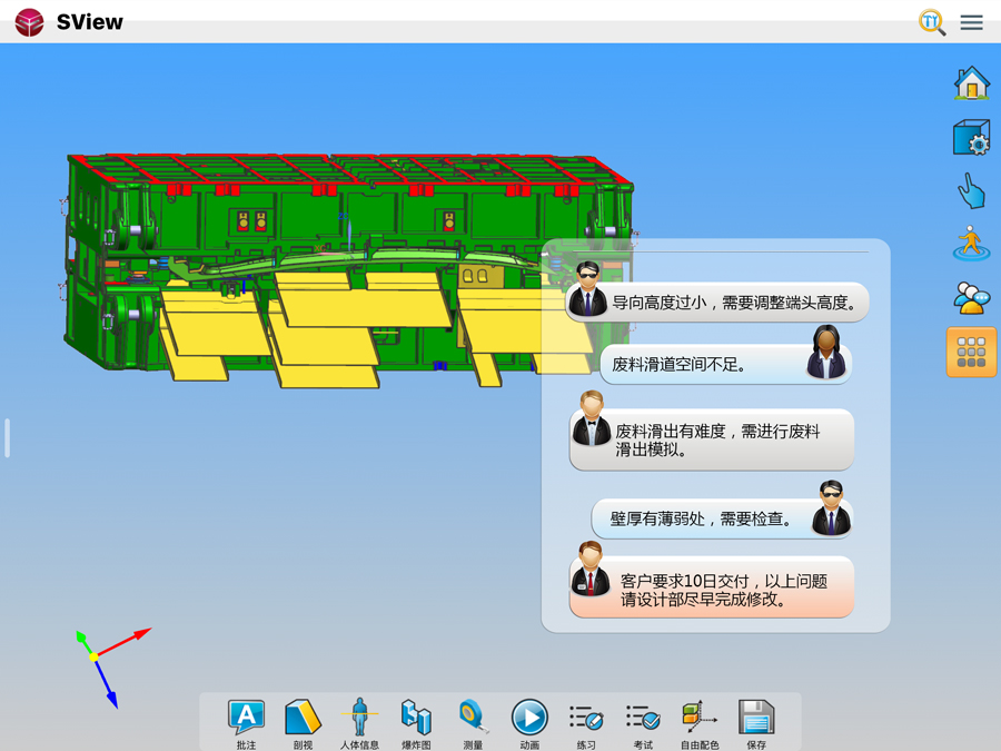一個(gè)模具企業(yè)的新產(chǎn)品協(xié)同評審會(huì )議中,通過(guò)視頻、語(yǔ)音、文本交流對模具的零件表面缺陷、結構可靠性、工藝性進(jìn)行分析,模具設計人員可以實(shí)時(shí)記錄各方評審意見(jiàn),方便完善模具3D設計。最后在SView協(xié)同會(huì )議中還可以進(jìn)行會(huì )簽,確認相應責任。