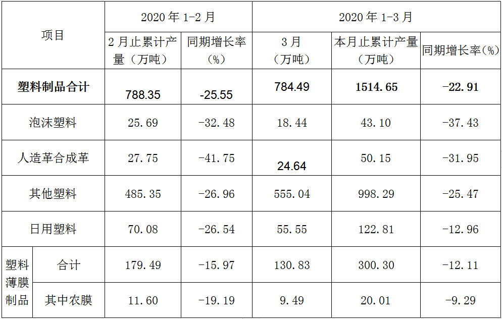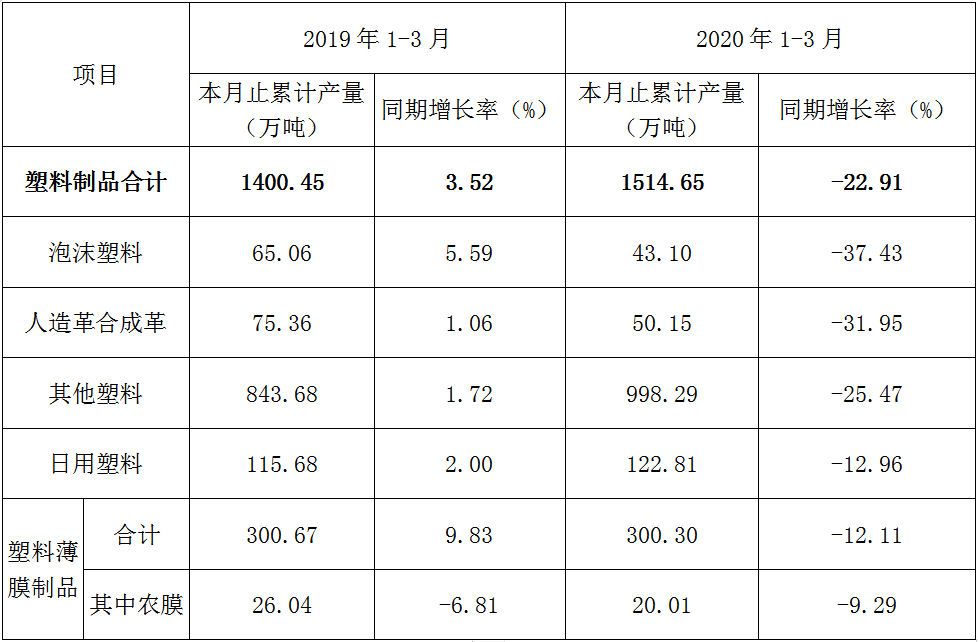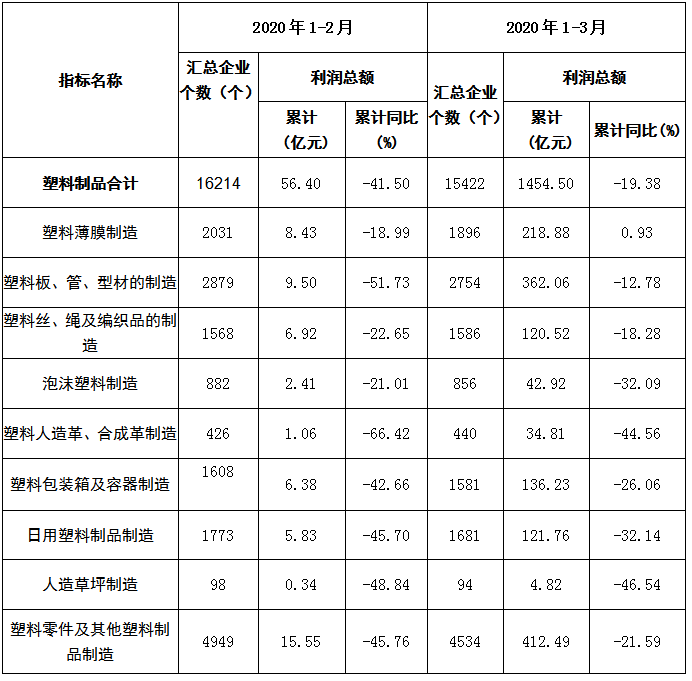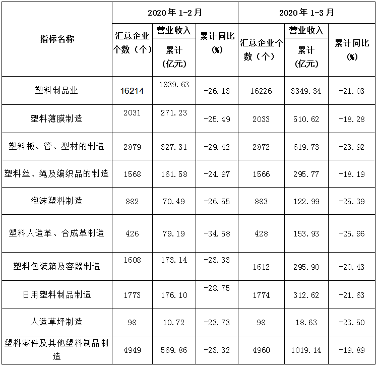 2020年1-3月,全國塑料制品行業(yè)匯總統計企業(yè)累計完成產(chǎn)量1514.65萬(wàn)噸,同比下降22.91%,增長(cháng)率比上年同期降低了26.43%;16226家規模以上企業(yè)營(yíng)業(yè)收入3349.34億元,同比下降21.03%,增長(cháng)率比上年同期降低了29.91%;實(shí)現利潤145.45億元,同比下降19.38%,增長(cháng)率比上年同期降低了35.45%;營(yíng)業(yè)收入利潤率為4.34%,比上年同期下降了0.03%;塑料制品累計出口額144.58億美元,同比下降9.46%,增長(cháng)率比上年同期降低17.04%。(統計口徑不一,各年數據不可直接相比)