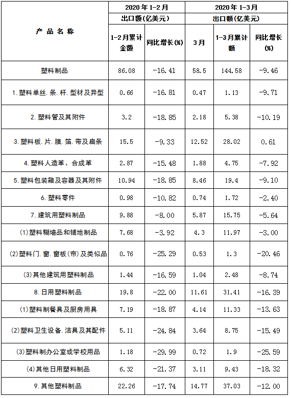 2020年1-3月與1-2月相比,塑料制品累計完成產(chǎn)量、收入、效益、累計出口額降幅收窄。