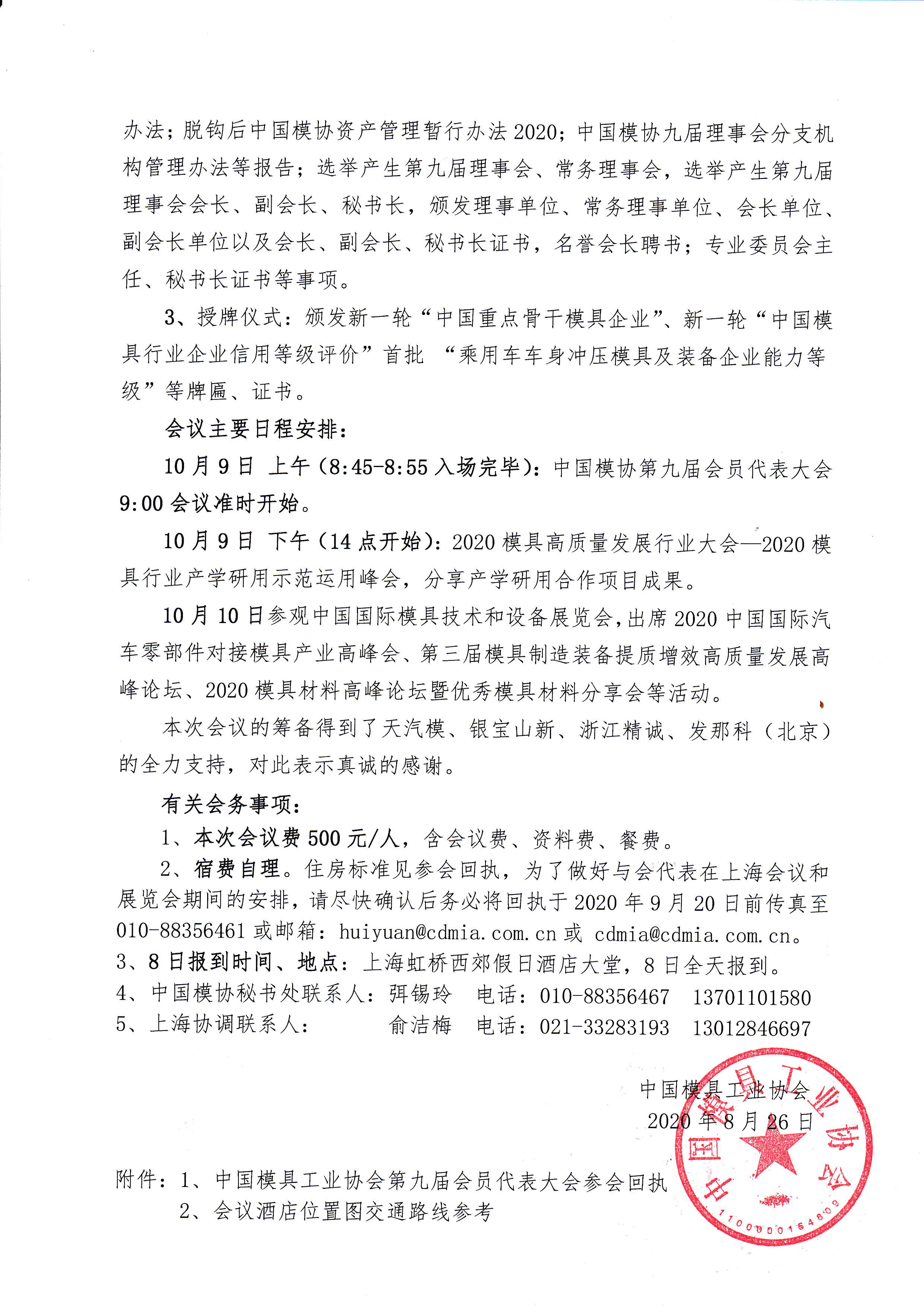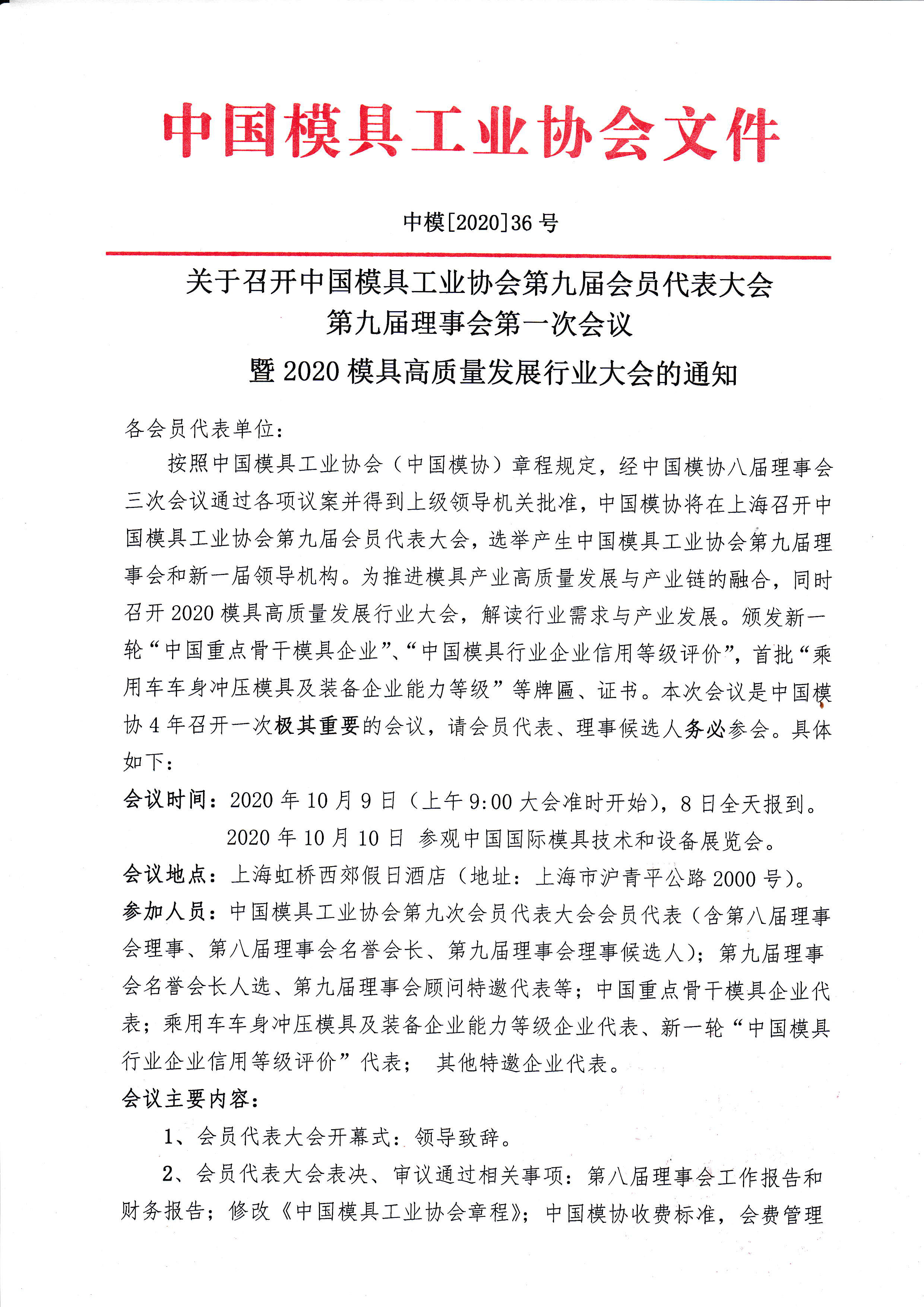 關(guān)于召開(kāi)中國模具工業(yè)協(xié)會(huì )第九屆會(huì )員代表大會(huì ) 第九屆理事會(huì )第一次會(huì )議暨2020模具高質(zhì)量發(fā)展行業(yè)大會(huì )的通知