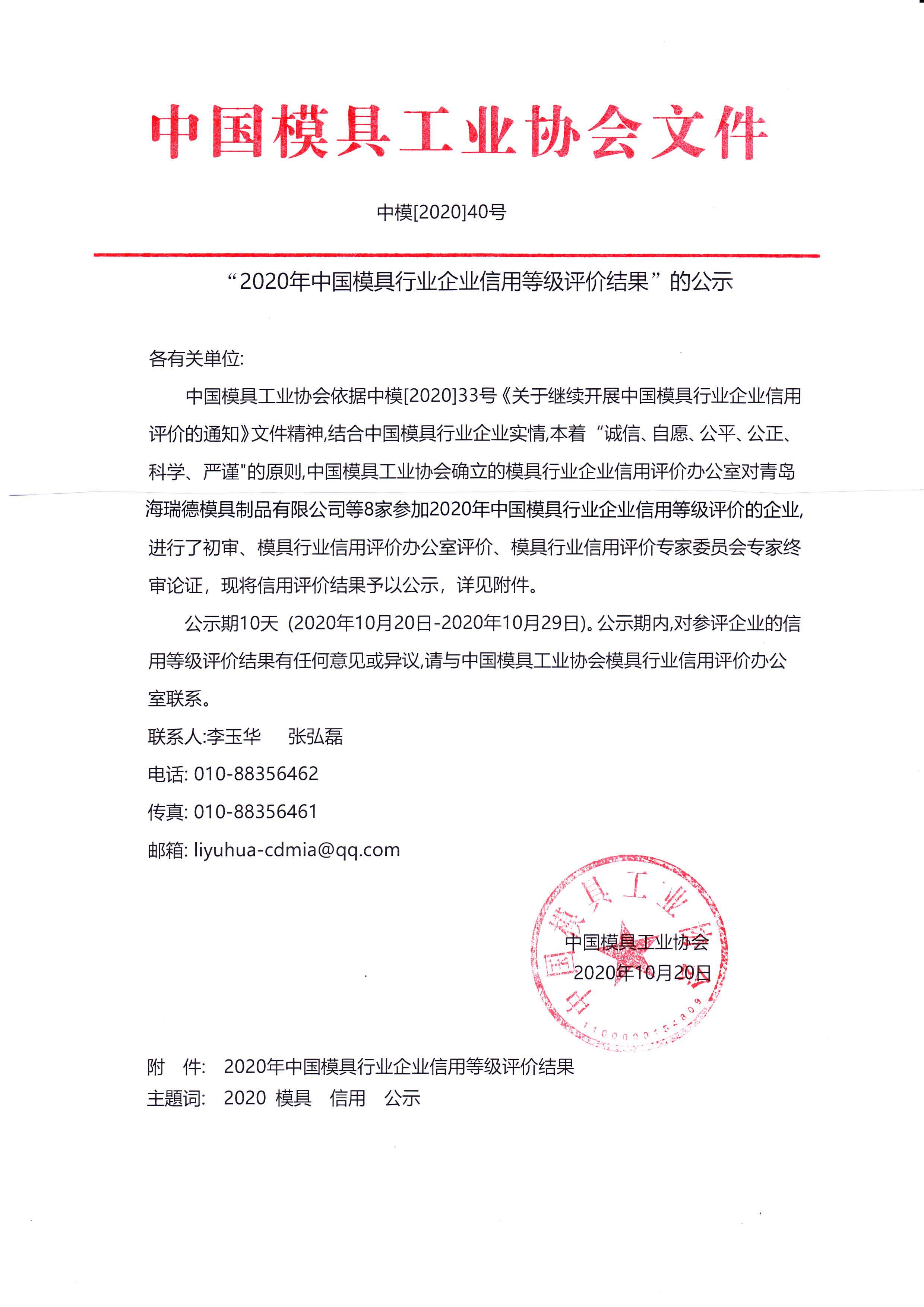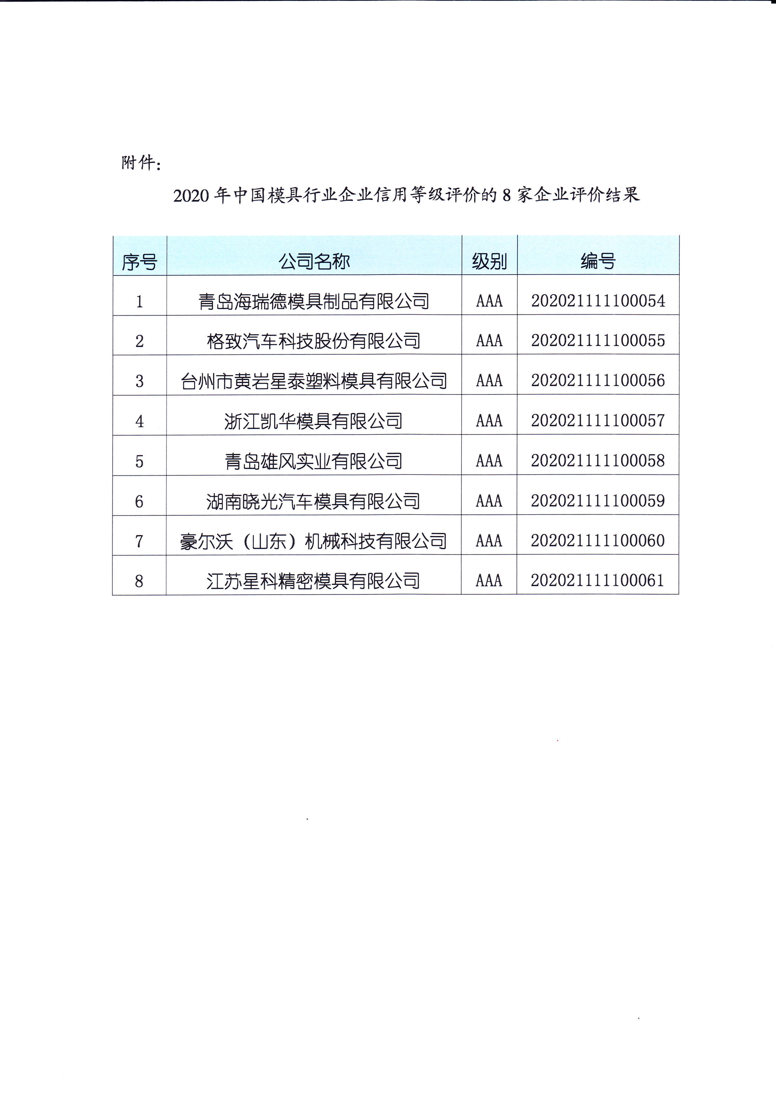 “2020年中國模具行業(yè)企業(yè)信用等級評價(jià)結果”的公示