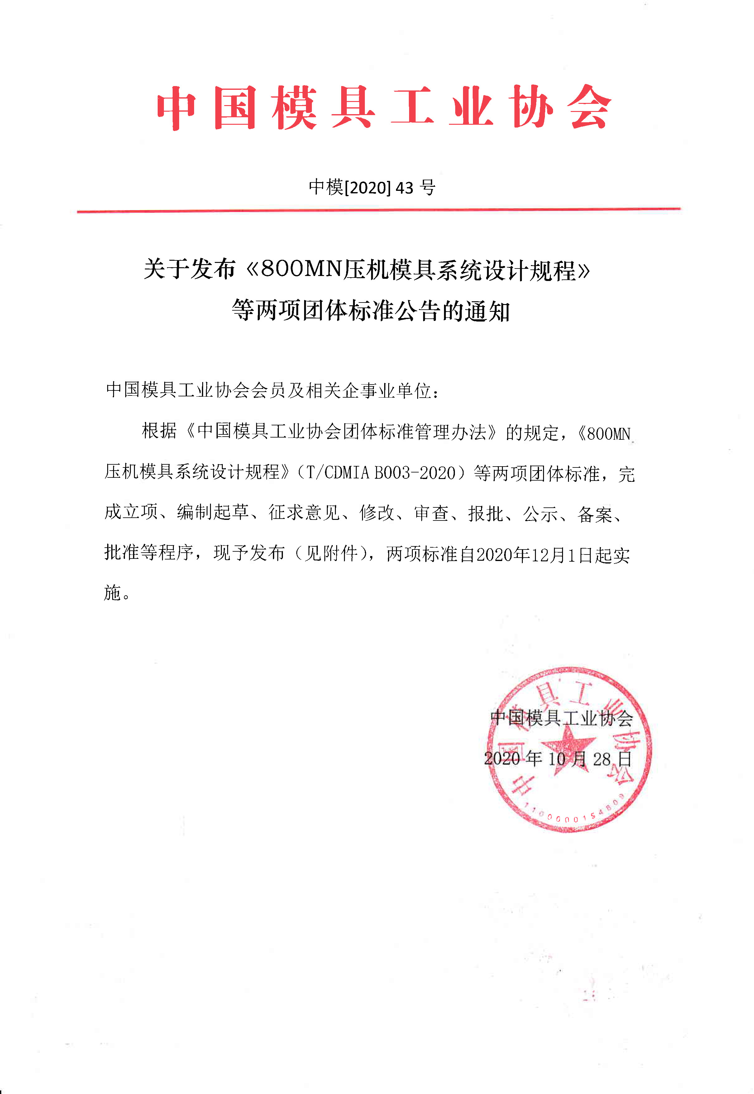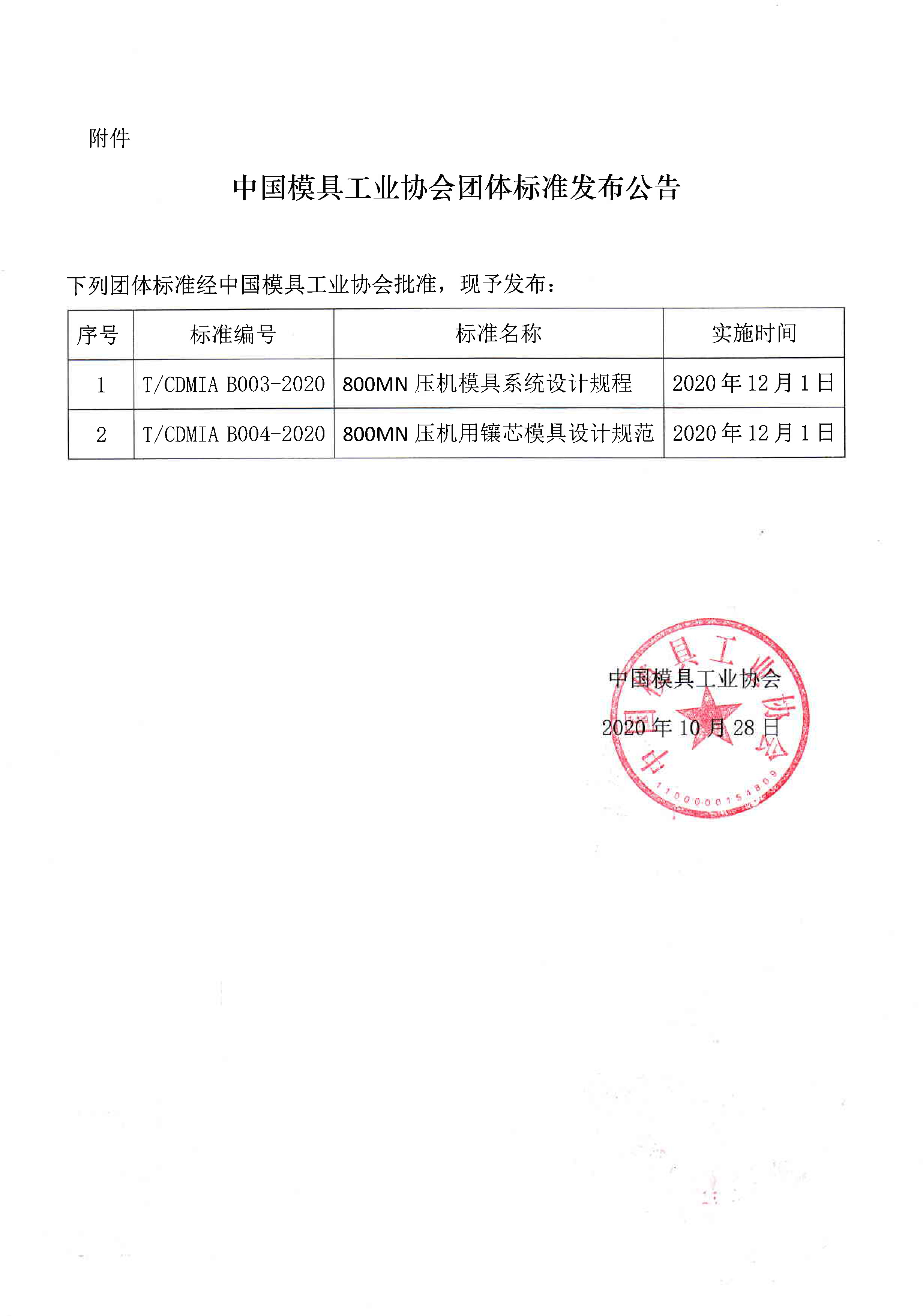 關(guān)于發(fā)布《800MN壓機模具系統設計規程》等兩項團體標準公告的通知