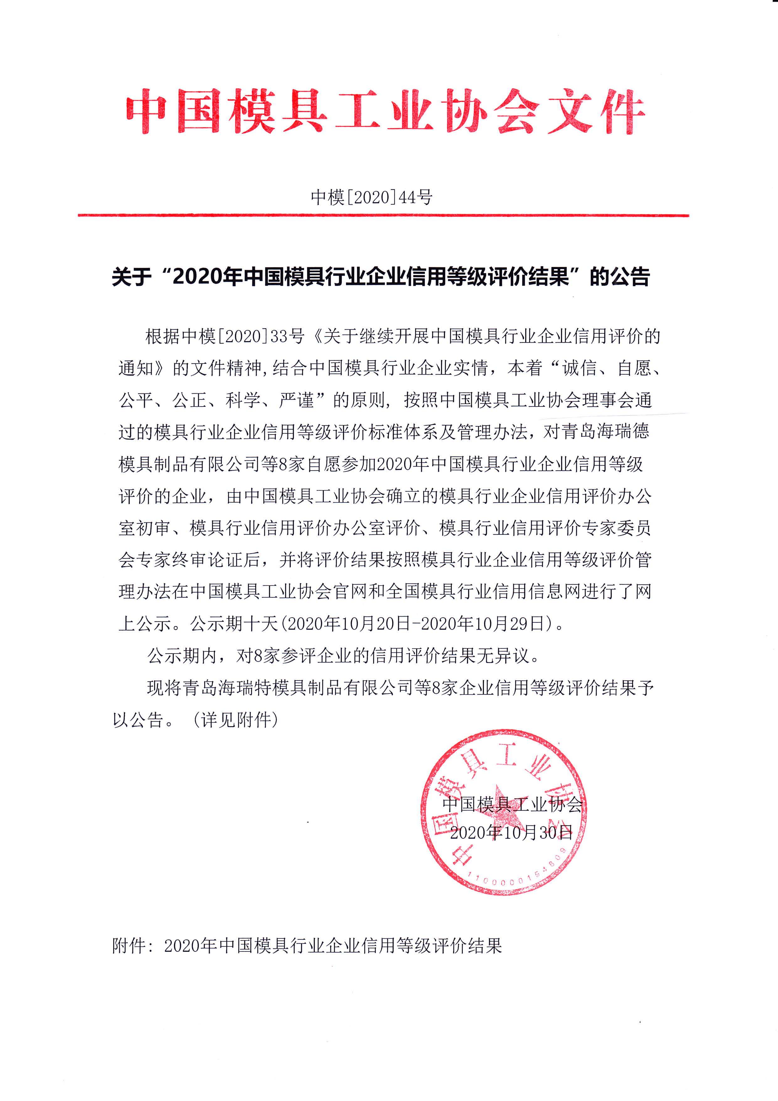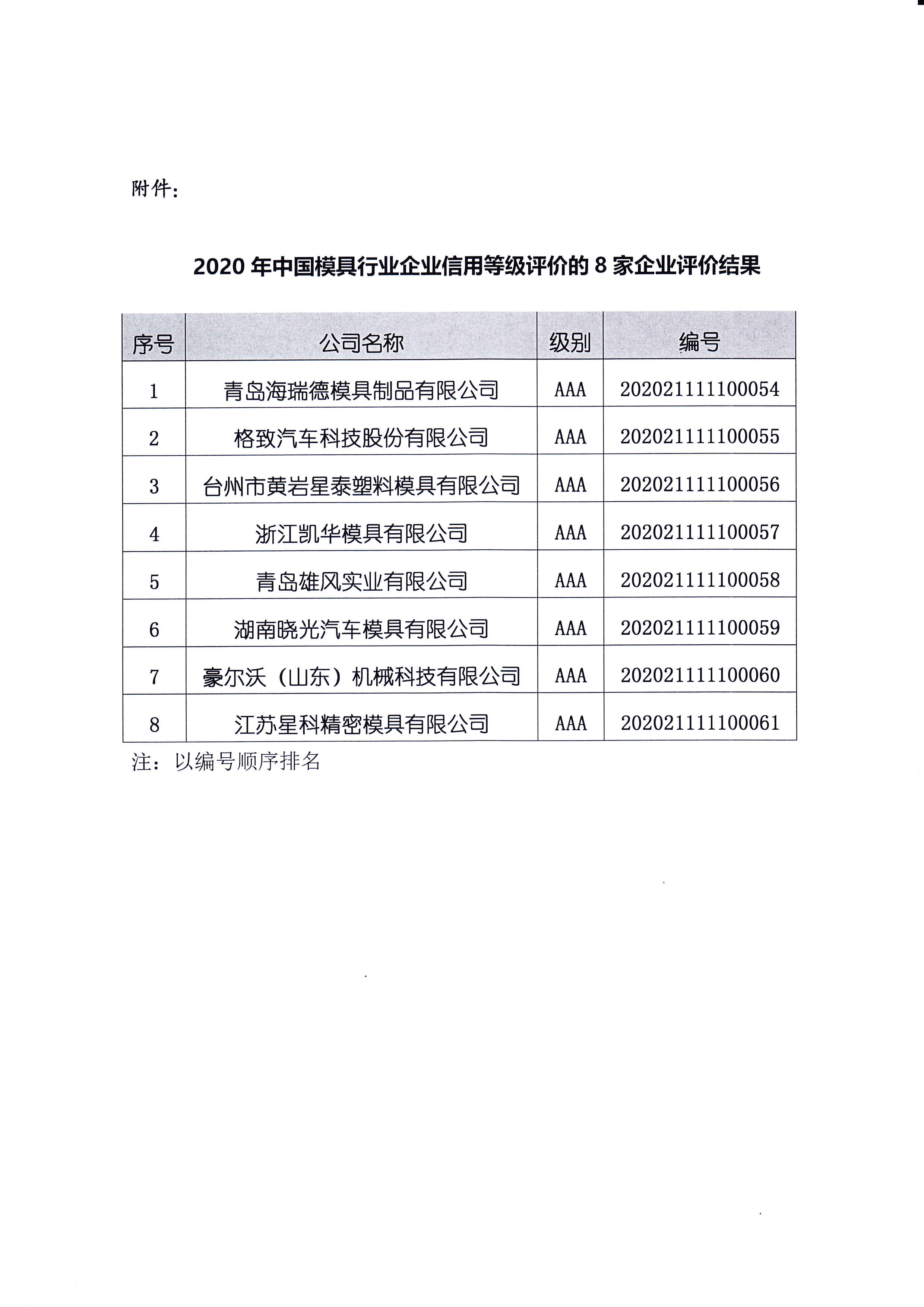關(guān)于“2020年中國模具行業(yè)企業(yè)信用等級評價(jià)結果”的公告