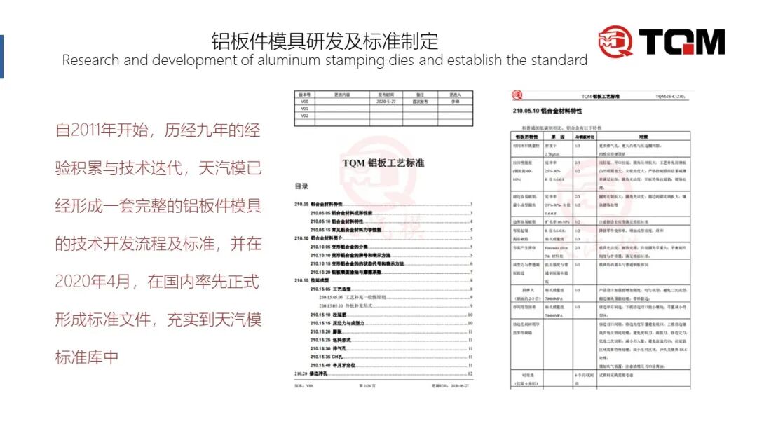 自2011年開(kāi)始,歷經(jīng)九年的經(jīng)驗積累與技術(shù)迭代,天汽模已經(jīng)形成一套完整的鋁板件模具的技術(shù)開(kāi)發(fā)流程及標準,并在2020年4月,在國內率先正式形成標準文件,充實(shí)到天汽模標準庫中