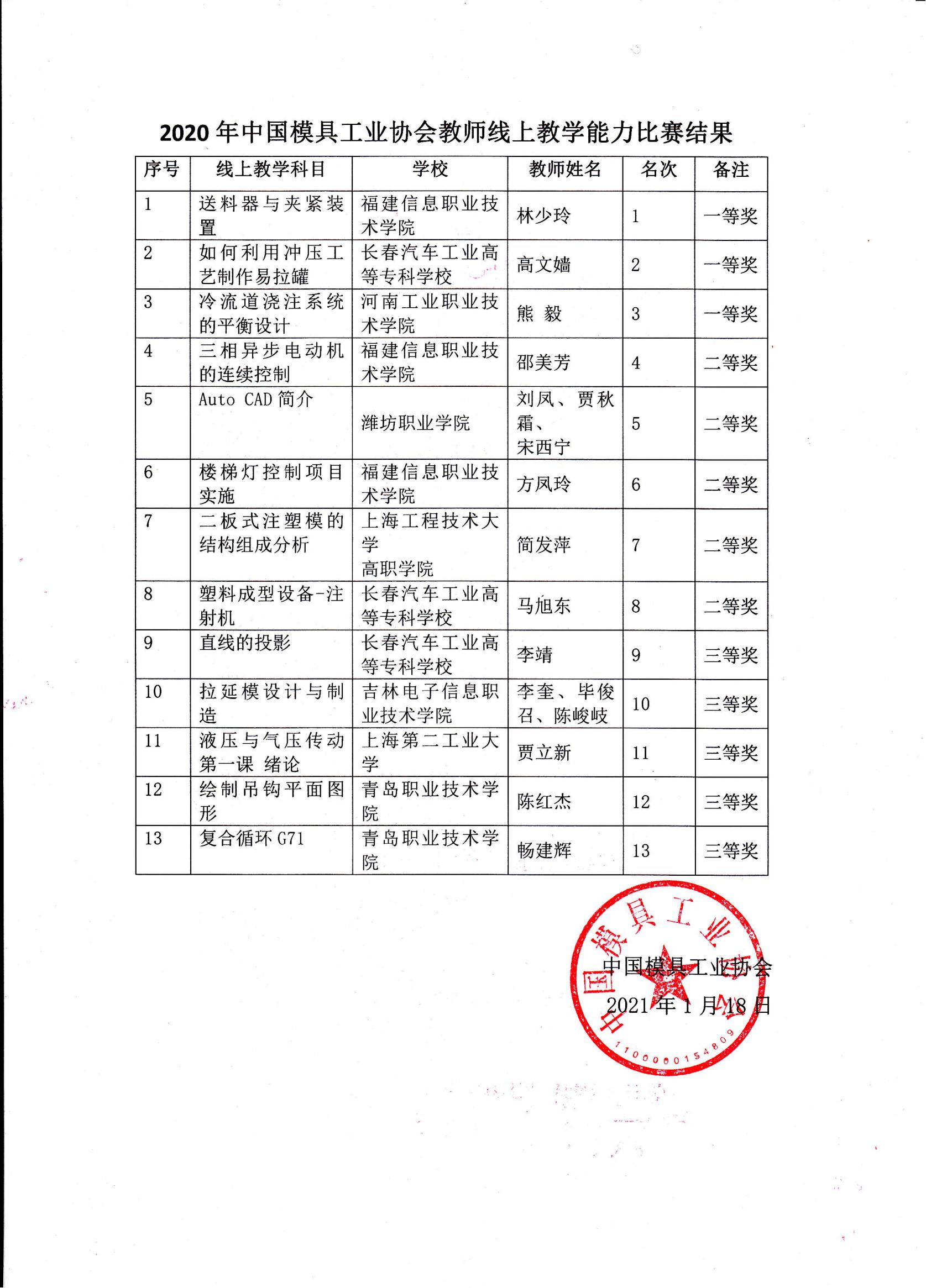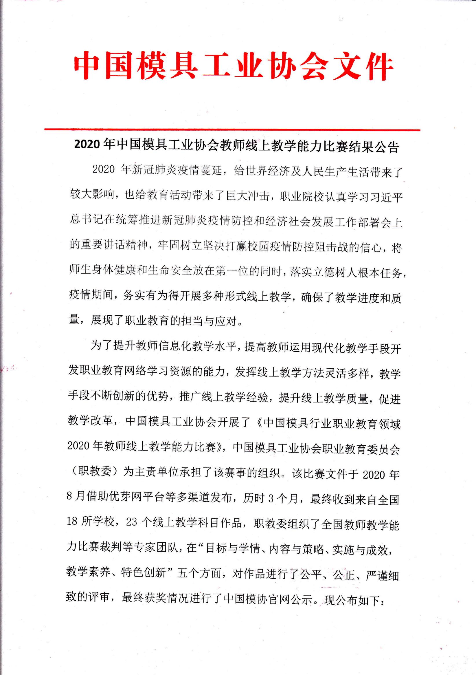 2020年中國模具工業(yè)協(xié)會(huì )教師線(xiàn)上教學(xué)能力比賽結果公告