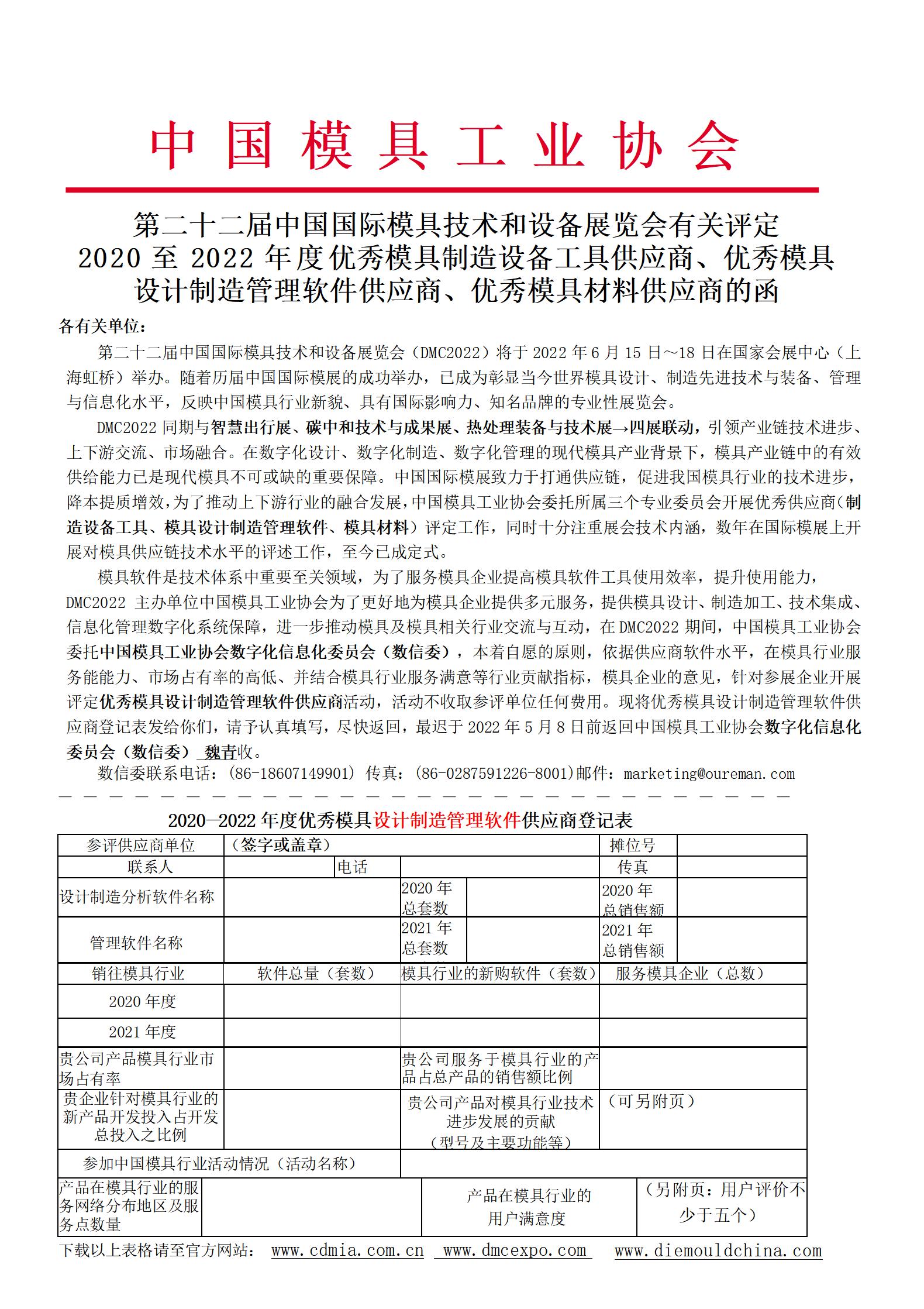 第二十二屆中國國際模具技術(shù)和設備展覽會(huì )有關(guān)評定 2020至2022年度優(yōu)秀模具制造設備工具供應商、優(yōu)秀模具設計制造管理軟件供應商、優(yōu)秀模具材料供應商的函