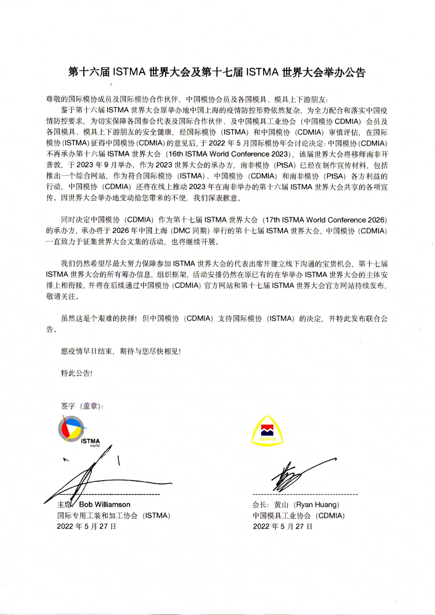 第十六屆ISTMA世界大會(huì )及第十七屆ISTMA世界大會(huì )舉辦公告