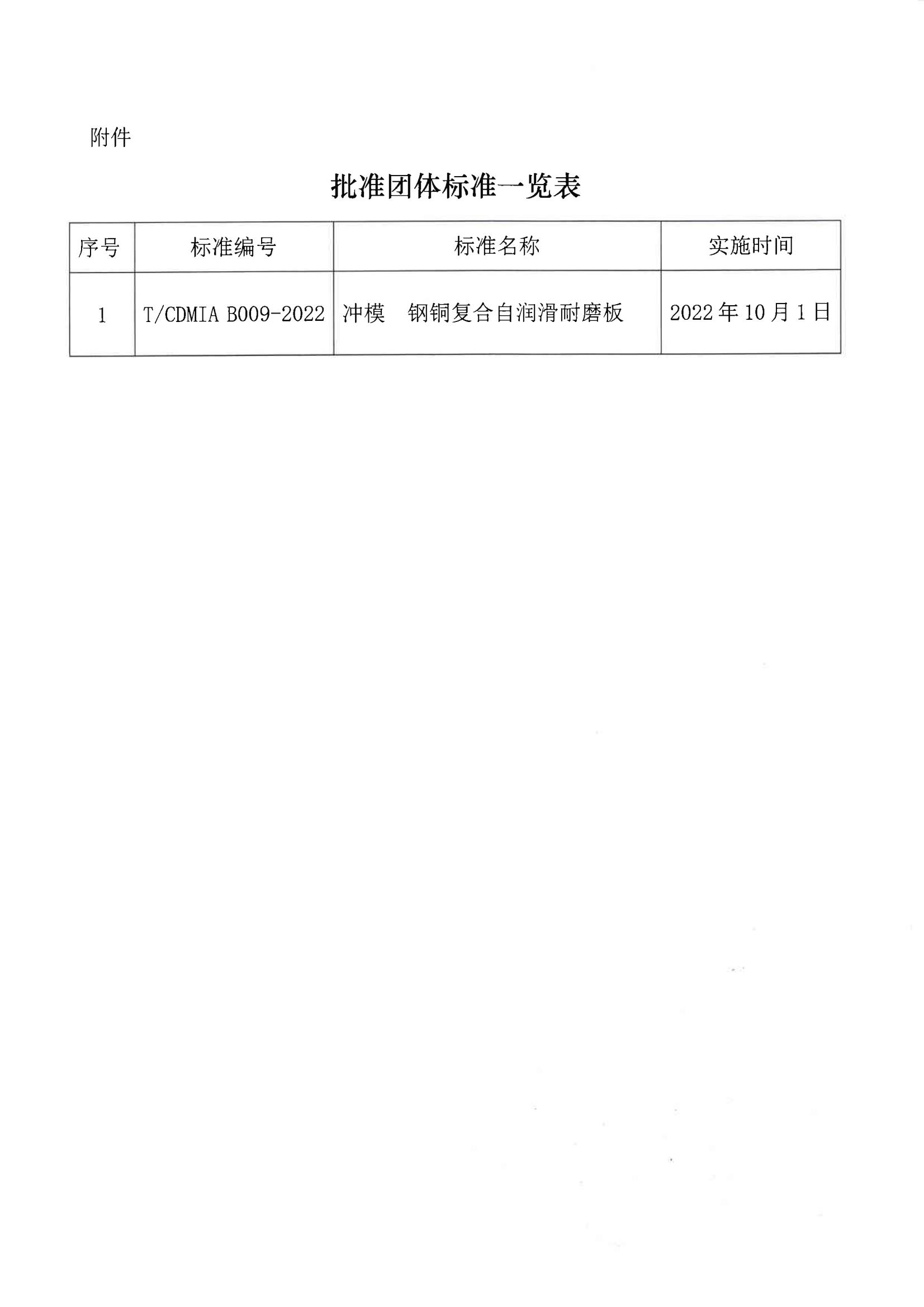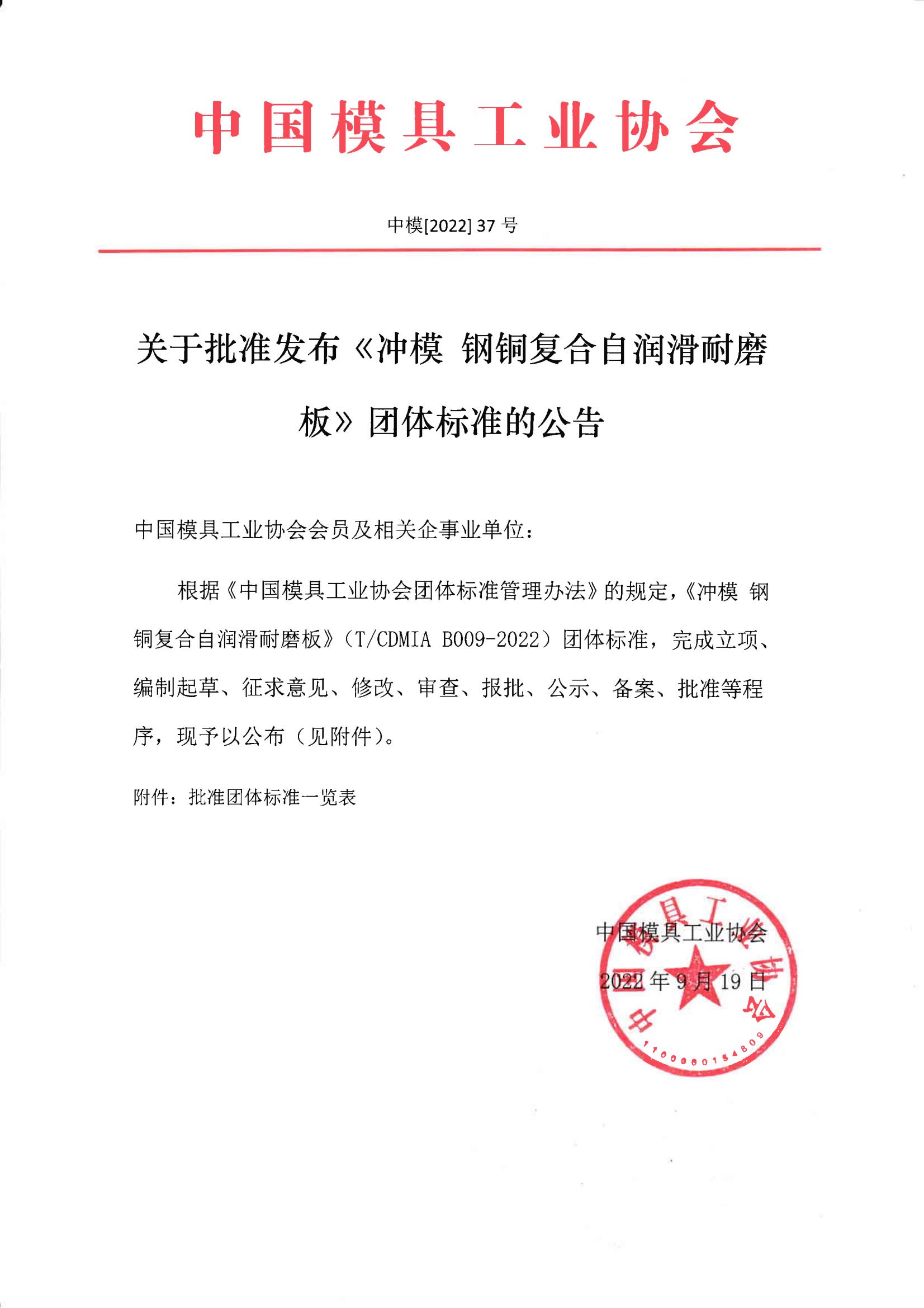 關(guān)于批準發(fā)布《沖模 鋼銅復合自潤滑耐磨板》團體標準的公告