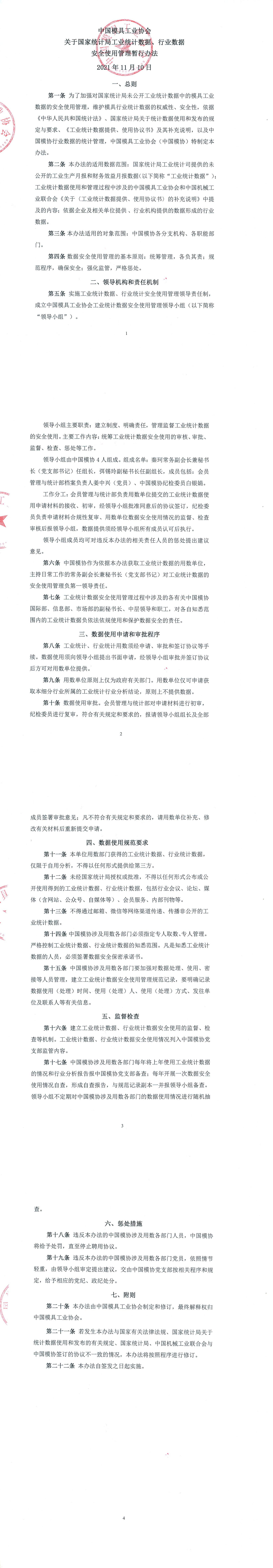 中國模具工業(yè)協(xié)會(huì )關(guān)于國家統計局工業(yè)統計數據、行業(yè)數據安全使用管理暫行辦法