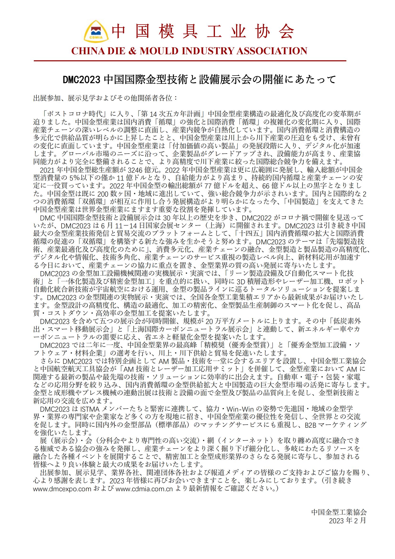 DMC2023 中國國際金型技術(shù)と設備展示會(huì )の開(kāi)催にあたって