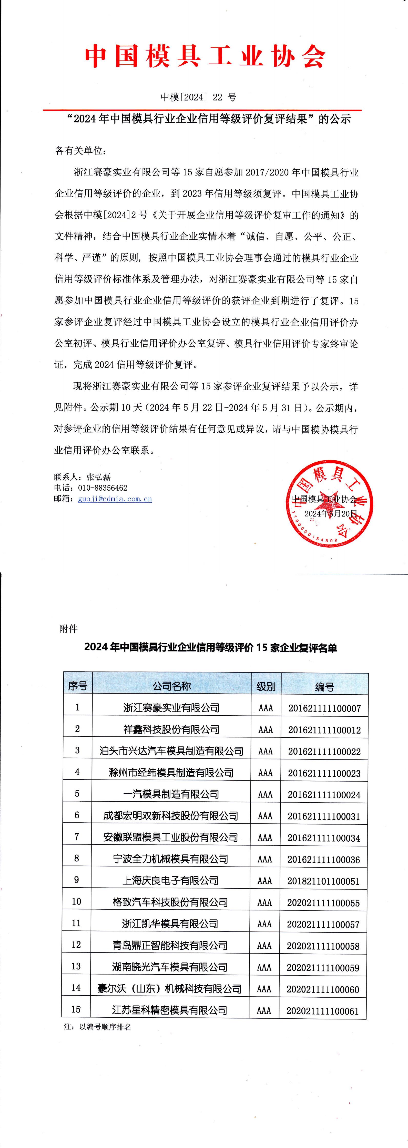 “2024年中國模具行業(yè)企業(yè)信用等級評價(jià)復評結果”的公示