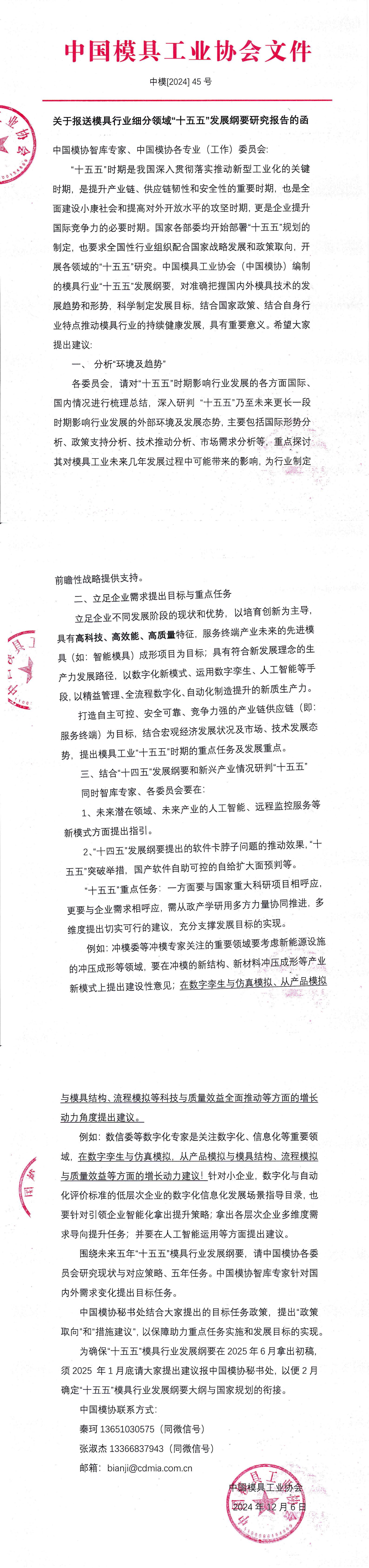 關(guān)于報送模具行業(yè)細分領(lǐng)域“十五五”發(fā)展綱要研究報告的函